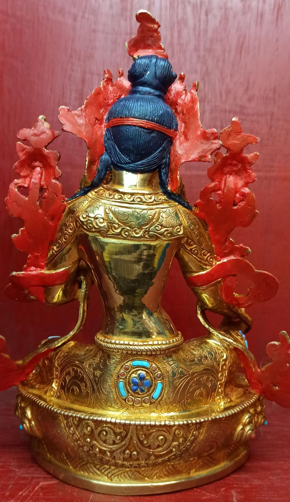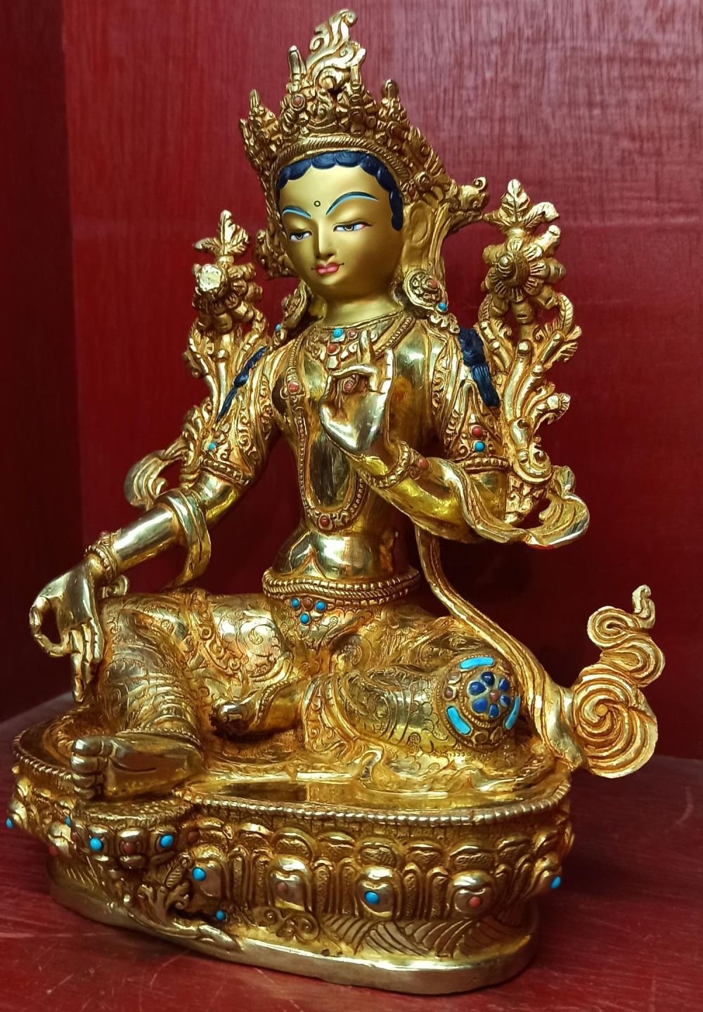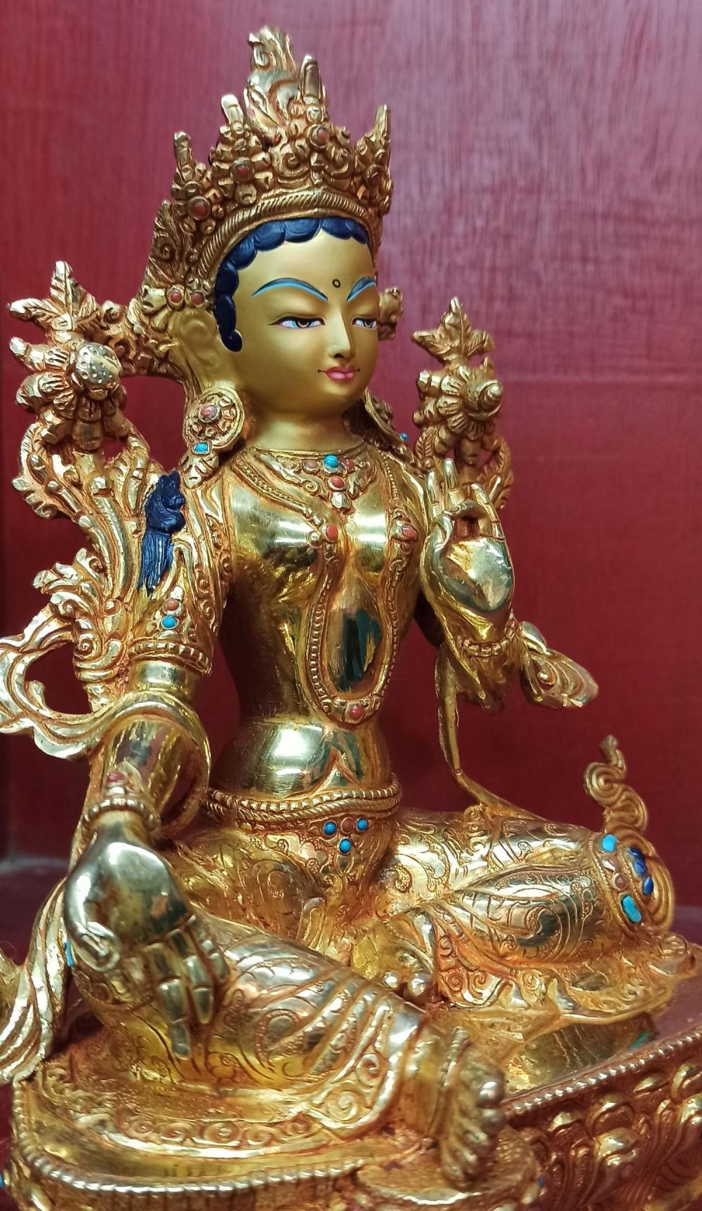 This Green Tara is finished with full gold plating. also known as mercury gold plating or fire gold plating. This traditional technique involves the application of a genuine layer of gold onto the Green Tara. Referred to as mercury gold plating, it is considered the correct and authentic form of gold plating in Nepal. Despite being more expensive than electroplating, this traditional mercury gold plating is gaining popularity again in Nepal. People are drawn to its authenticity, longevity, and the unmatched beauty it brings to the Green Tara. The resurgence of interest in this traditional form of gold plating reflects a growing appreciation for the craftsmanship and cultural heritage of Nepal Read More