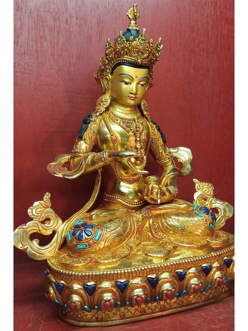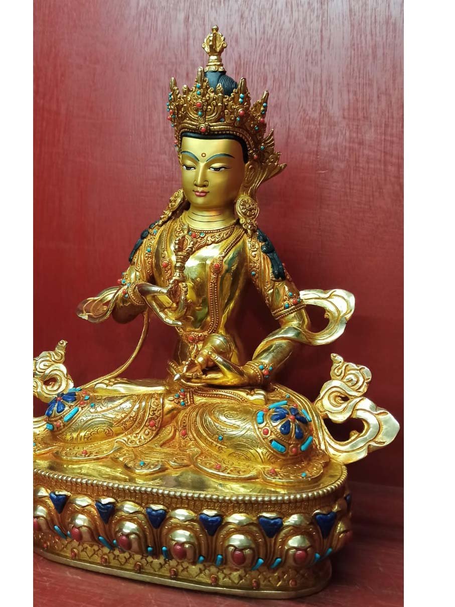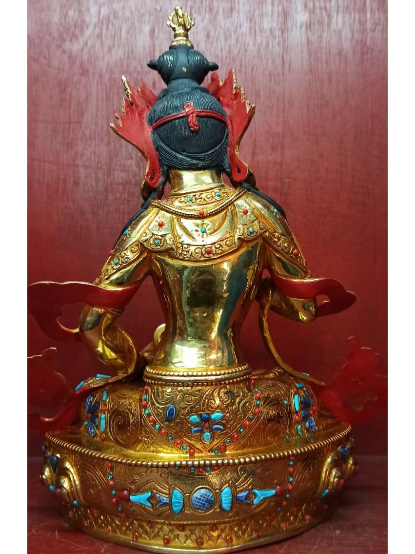 This Vajrasattva is finished with full gold plating. also known as mercury gold plating or fire gold plating. This traditional technique involves the application of a genuine layer of gold onto the Vajrasattva. Referred to as mercury gold plating, it is considered the correct and authentic form of gold plating in Nepal. Despite being more expensive than electroplating, this traditional mercury gold plating is gaining popularity again in Nepal. People are drawn to its authenticity, longevity, and the unmatched beauty it brings to the Vajrasattva. The resurgence of interest in this traditional form of gold plating reflects a growing appreciation for the craftsmanship and cultural heritage of Nepal Read More