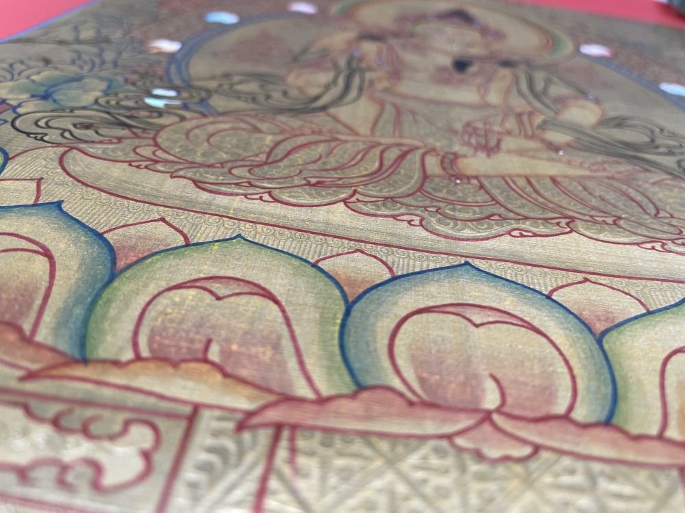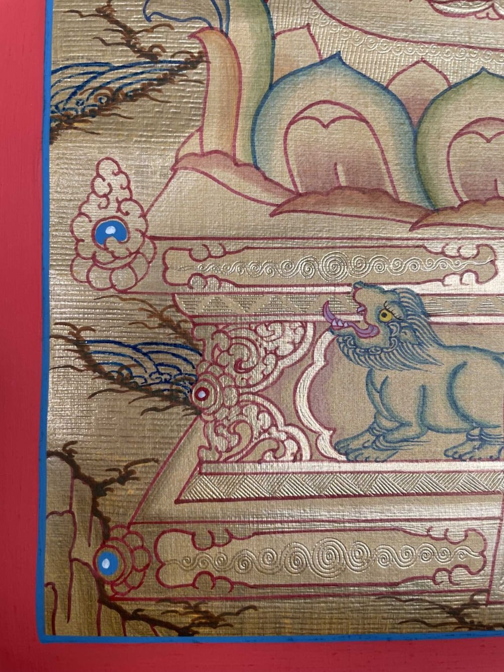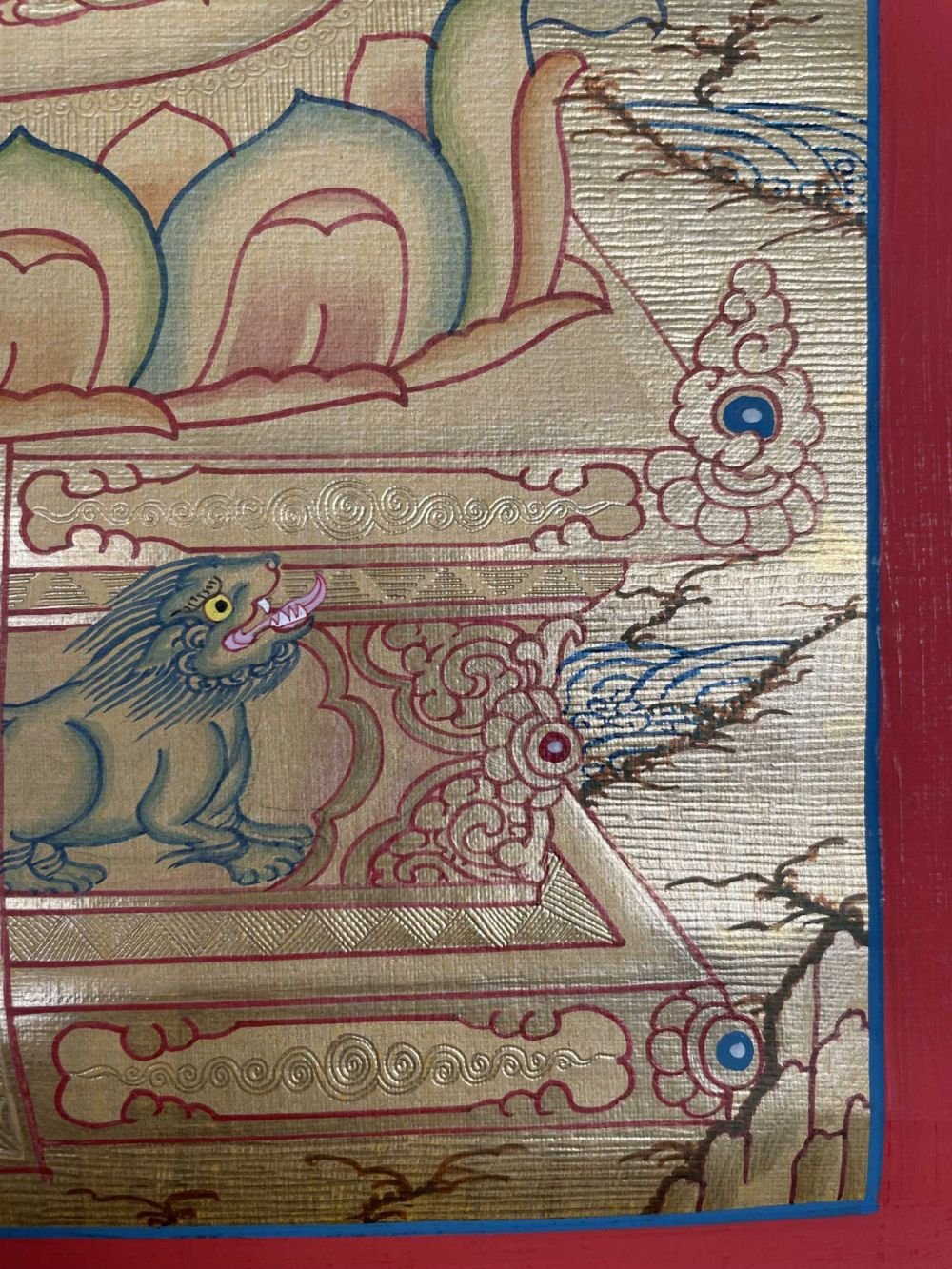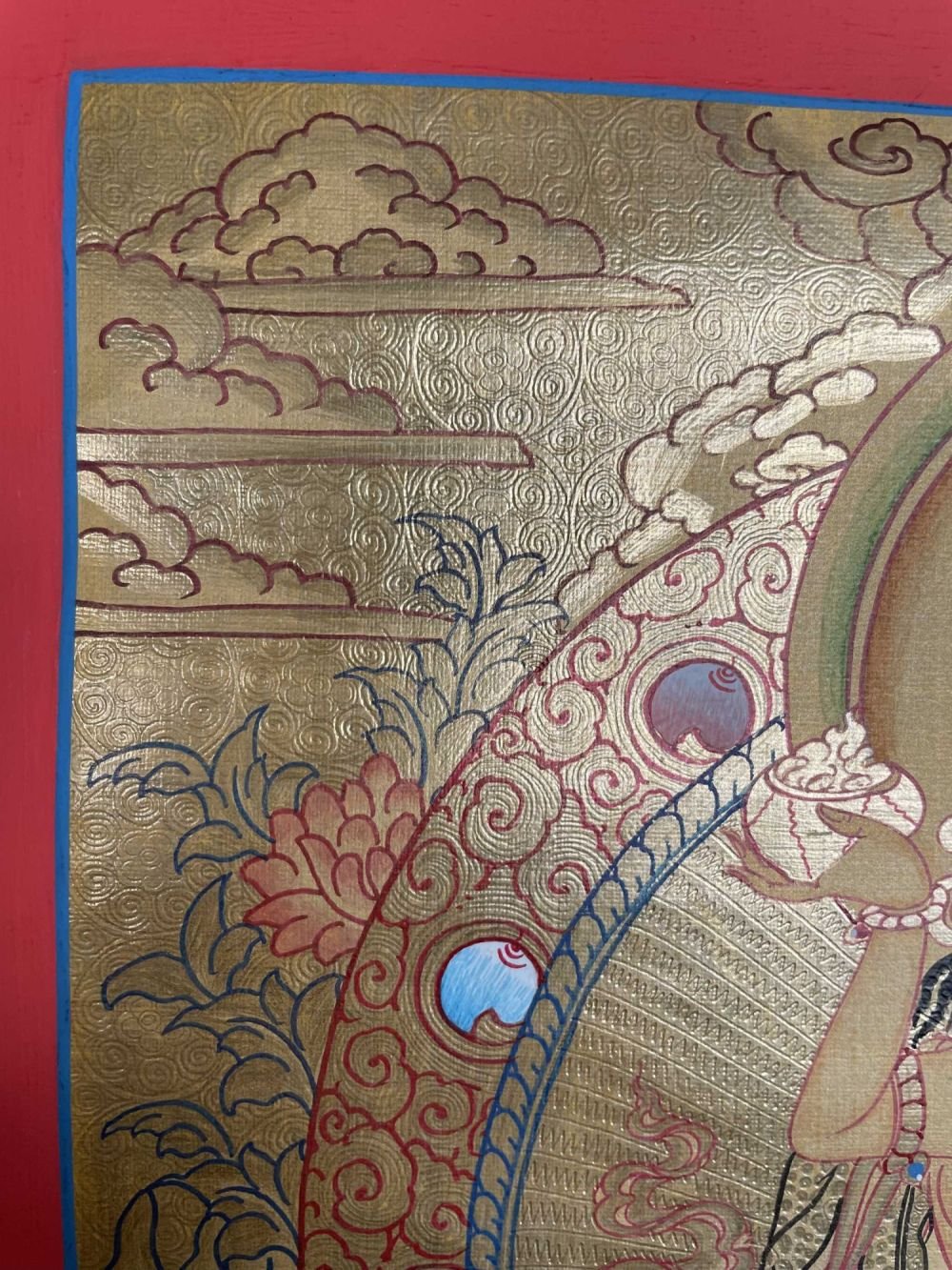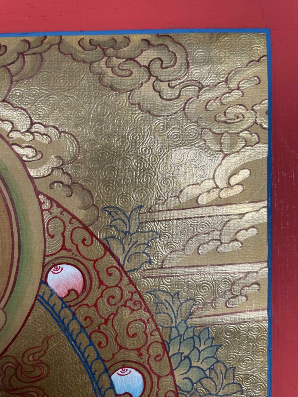 This thangka of Vajrasattva has real gold painted on its surface along with other paints. This is an ancient process of decorating the thangka in Tibetan Buddhism, Here gold is ground into gold dust, which is then mixed with other undisclosed material to make it paintable on the canvas. this mixture is then mixed with transparent glue and painted on the thangka. Read More
