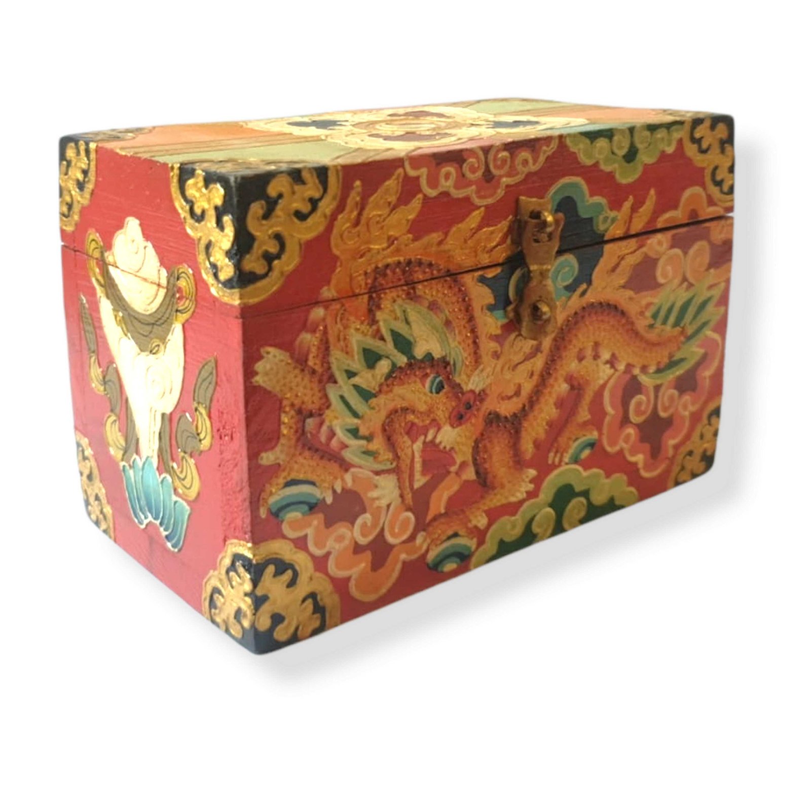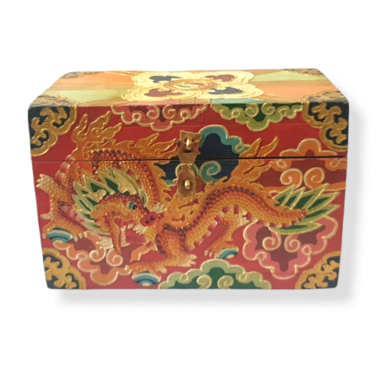A Tibetan wooden box is a handcrafted storage container made from wood and often adorned with intricate Tibetan motifs and vibrant colors. These boxes are typically crafted by skilled artisans using traditional techniques passed down through generations. The decorations on the box usually include symbols of good fortune, such as lotus flowers, endless knots, dragons, or mythical creatures, and are painted in vivid hues like red, blue, green, and gold. These motifs not only add to the aesthetic appeal but also carry significant cultural and spiritual meanings in Tibetan Buddhism. Read More