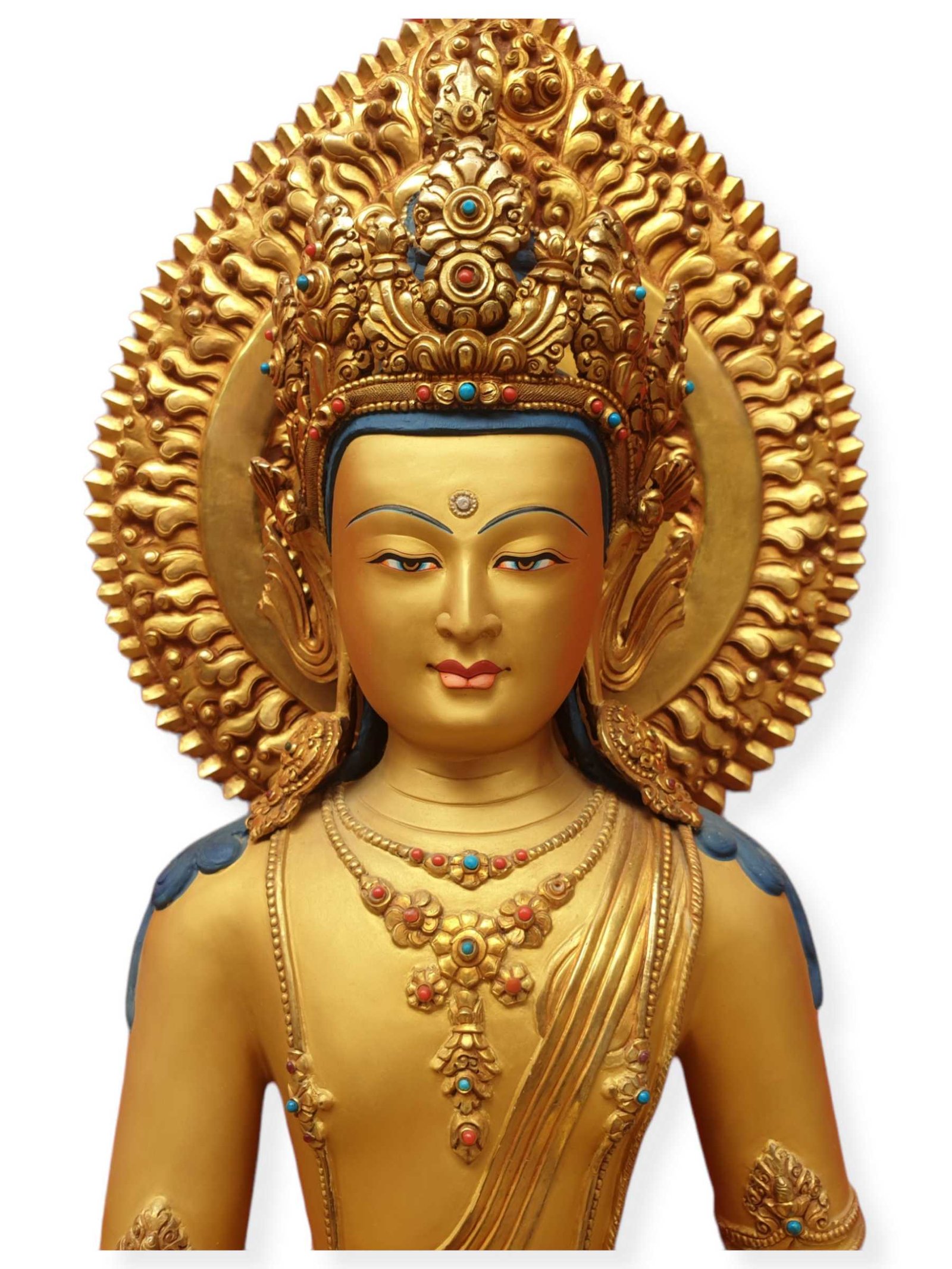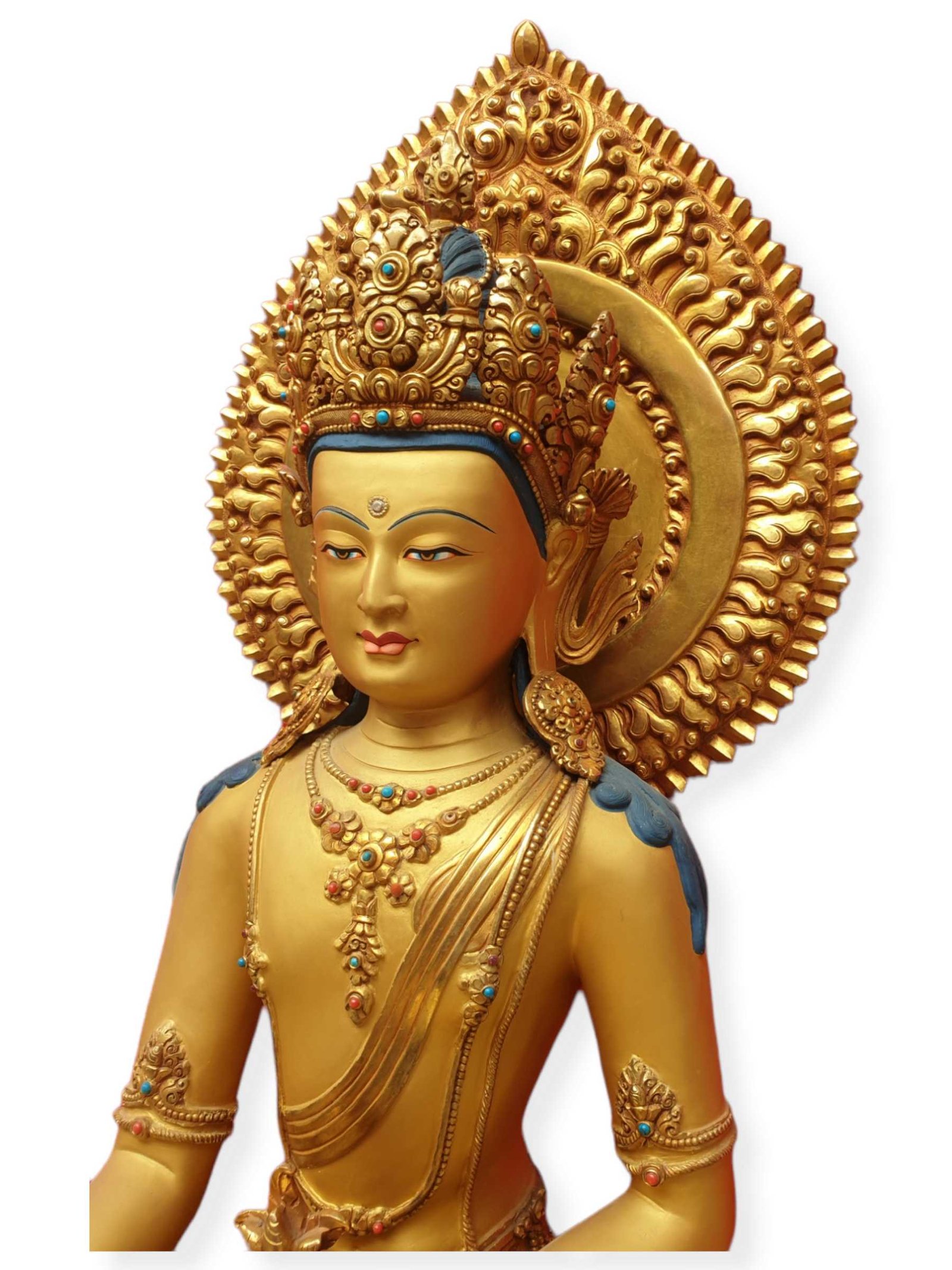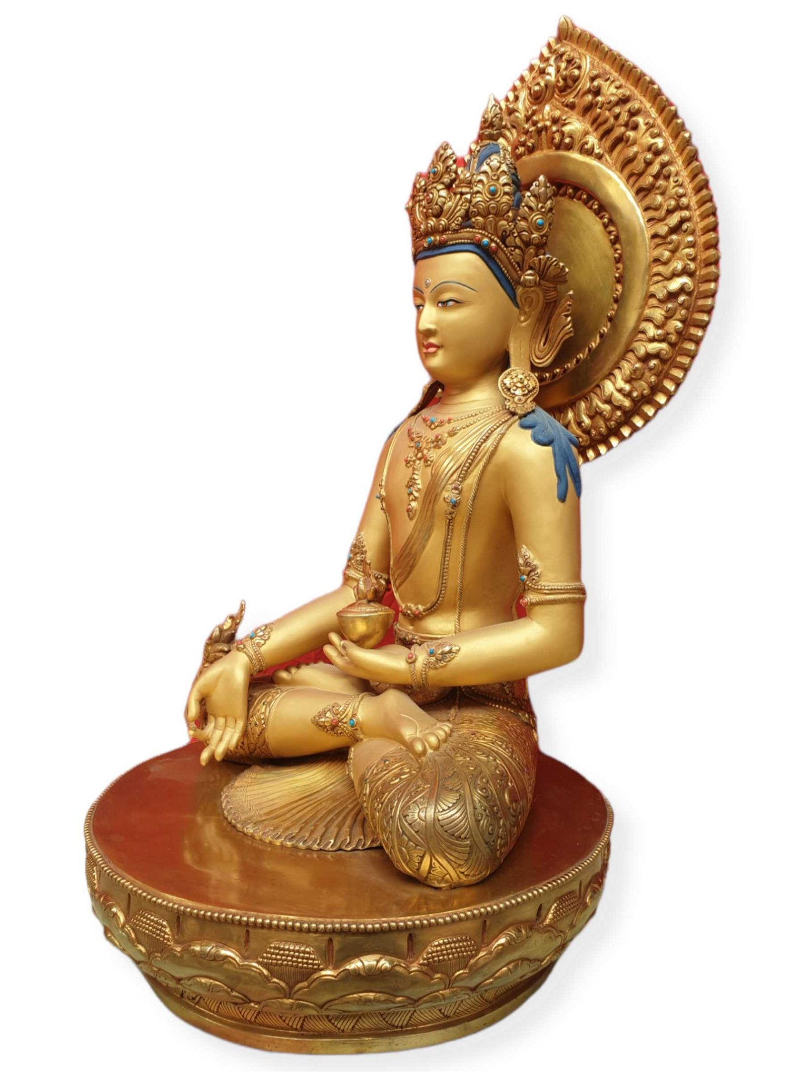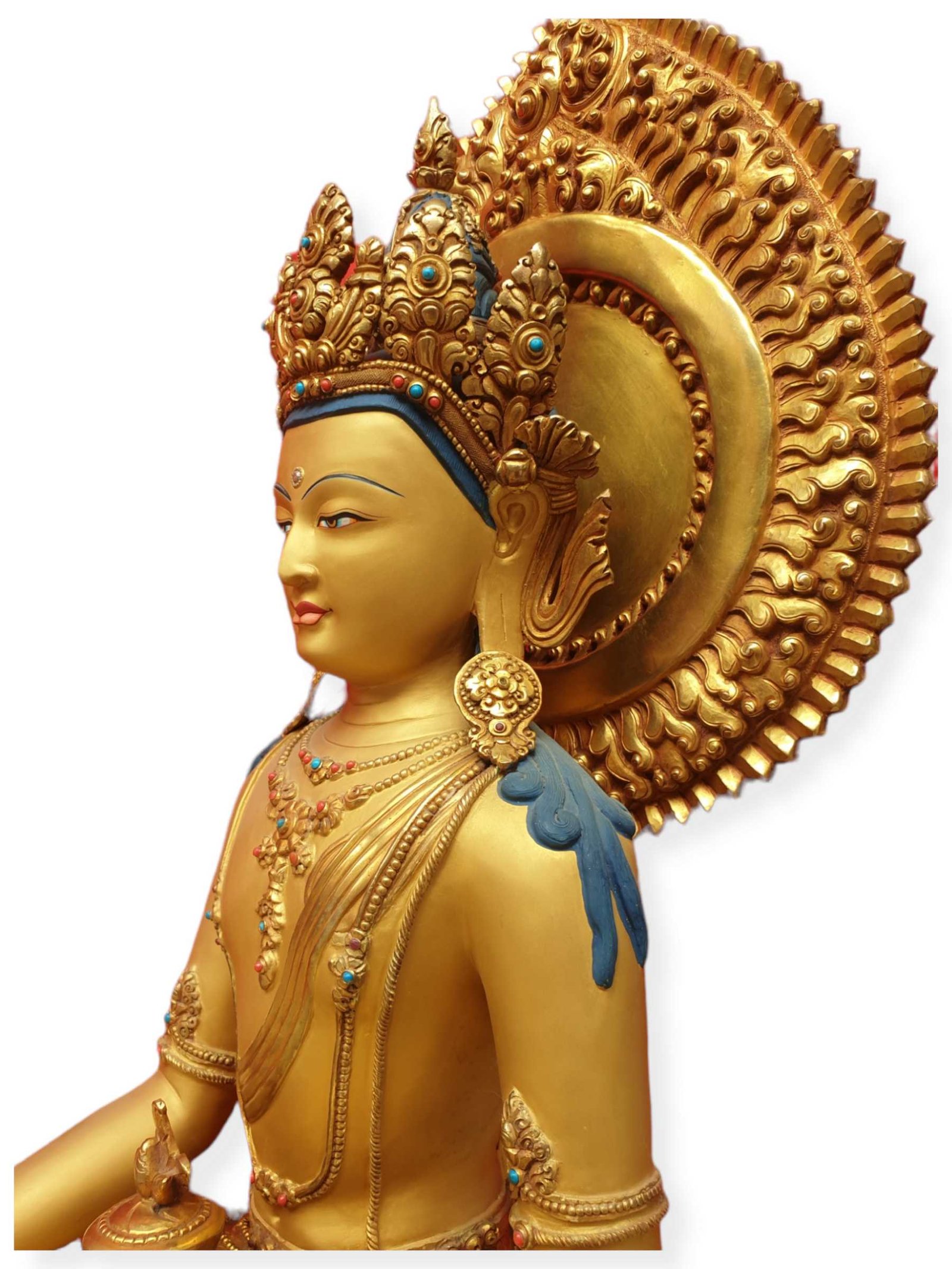 This Medicine Buddha is finished with full gold plating. also known as mercury gold plating or fire gold plating. This traditional technique involves the application of a genuine layer of gold onto the Medicine Buddha. Referred to as mercury gold plating, it is considered the correct and authentic form of gold plating in Nepal. Despite being more expensive than electroplating, this traditional mercury gold plating is gaining popularity again in Nepal. People are drawn to its authenticity, longevity, and the unmatched beauty it brings to the Medicine Buddha. The resurgence of interest in this traditional form of gold plating reflects a growing appreciation for the craftsmanship and cultural heritage of Nepal Read More