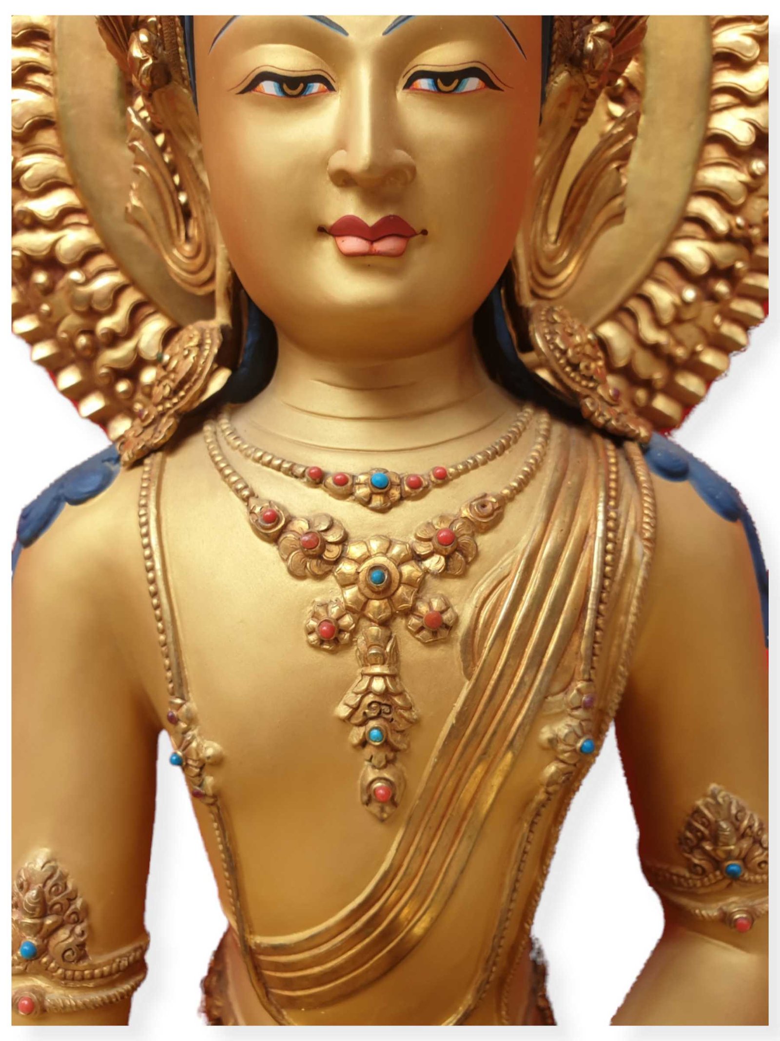 The face of Medicine Buddha is painted with gold to enhance its significant features, particularly the eyes, and lips. This detailed painting is essential as it brings forth the crucial attributes of the expression of eyes and lips that metal carving alone cannot capture.