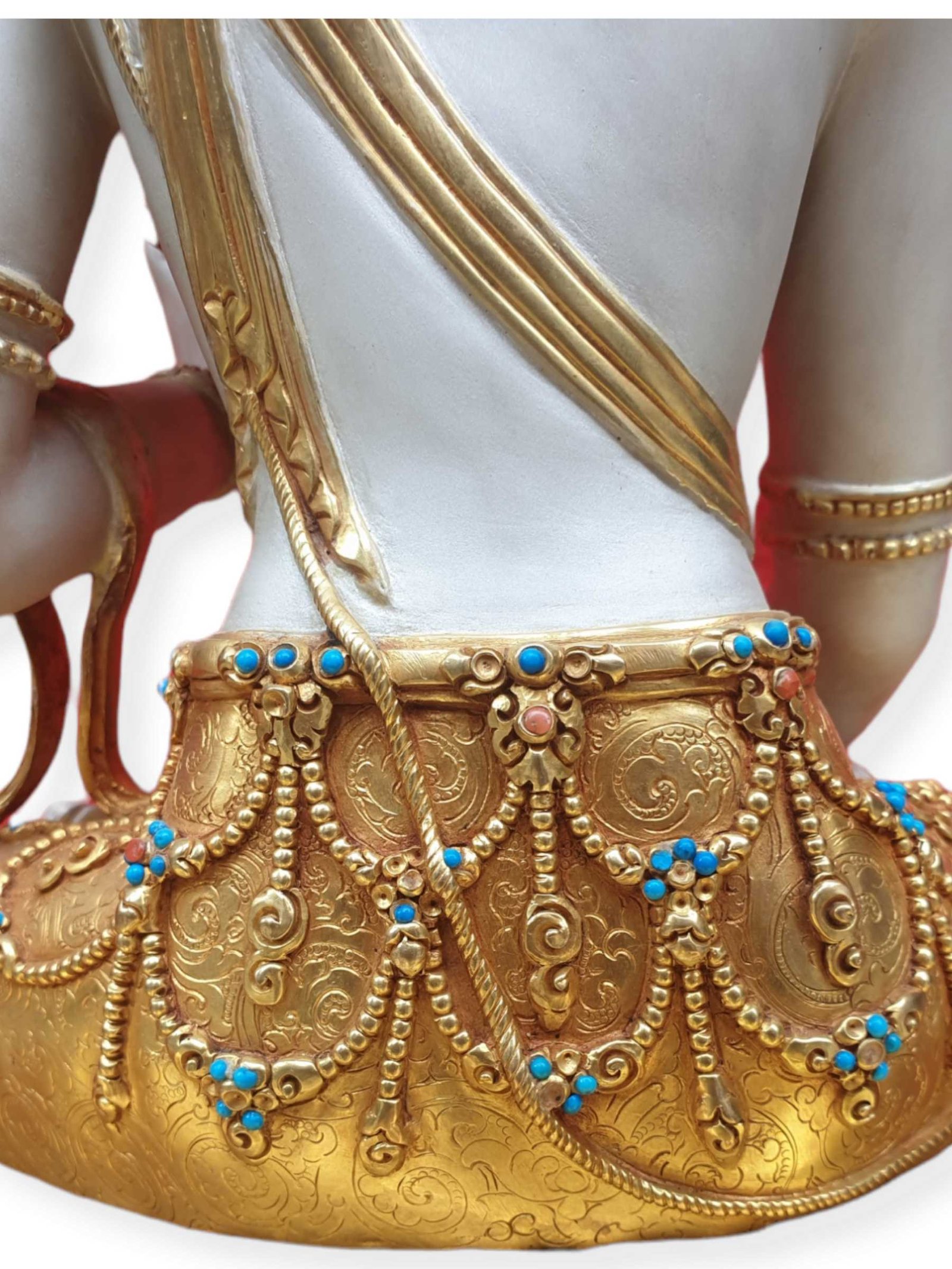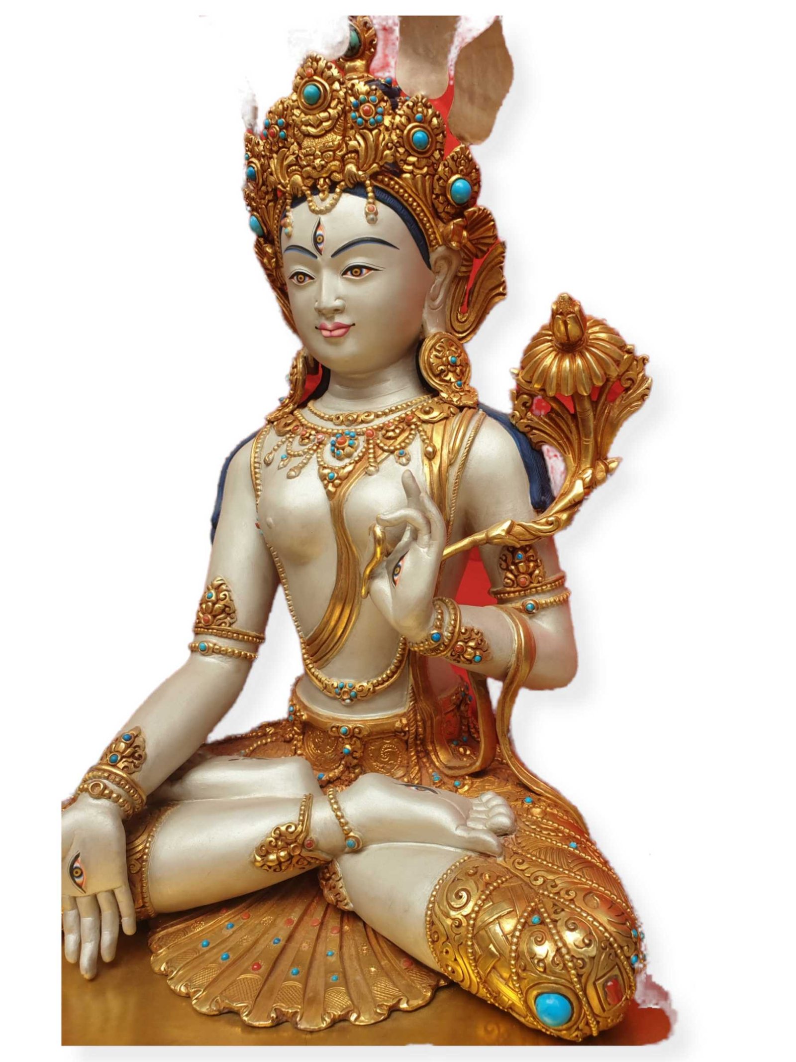33 cm Buddhist Handmade Statue of White Tara, Face Painted, Gold Plated, Stone Setting