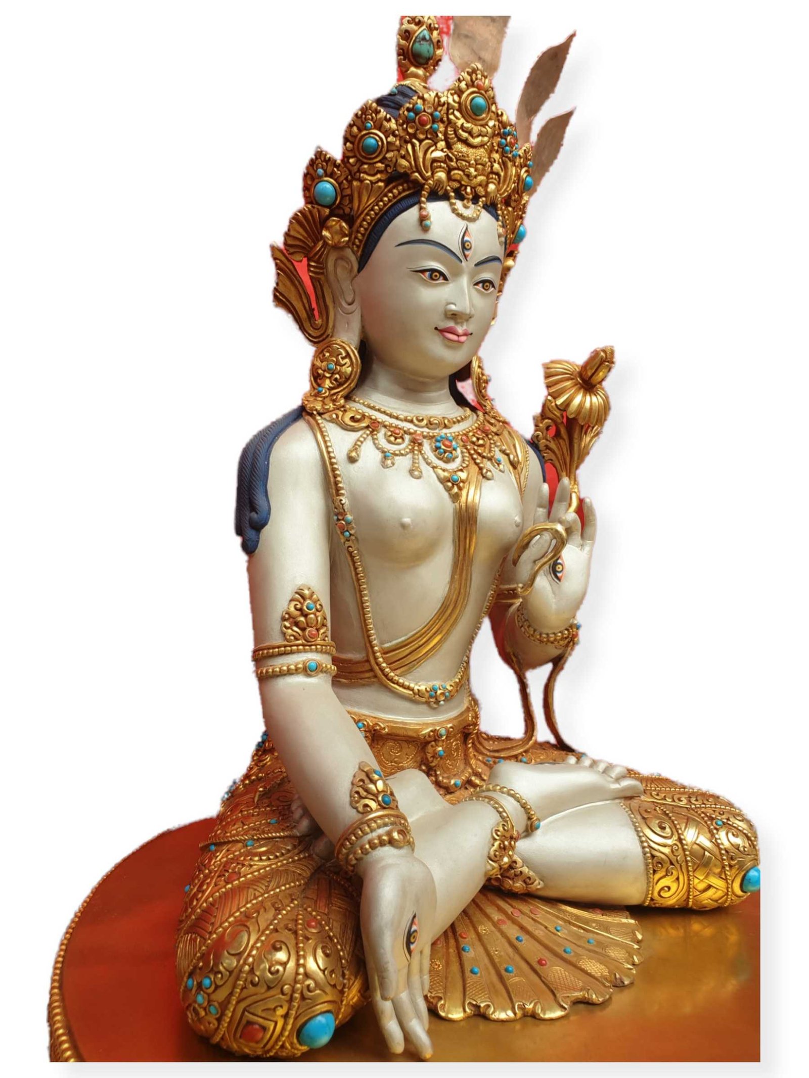 Master Quality,Buddhist Statue of White Tara, Traditional Color, Partly Gold Plated, Stone Setting, Museum Style , Goddess of longevity, healing, and serene compassion