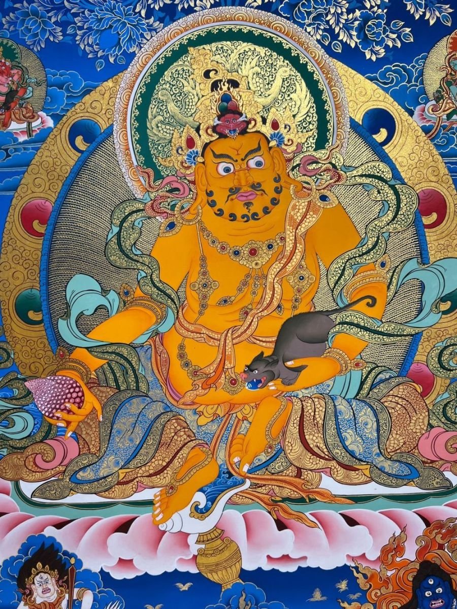 Tibetan Buddhist Thangka of Yellow Jambhala, Real 24k Gold, Hand Painted , fostering generosity and abundance