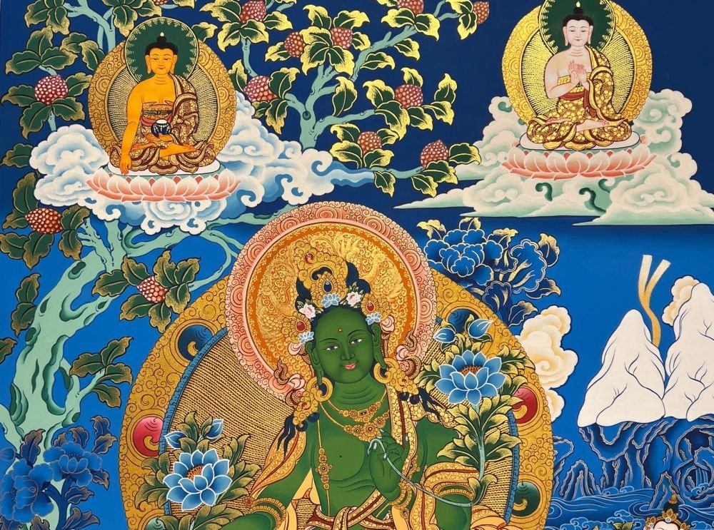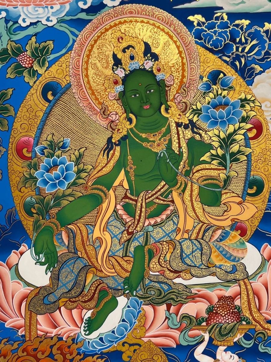 Tibetan Buddhist Thangka of Green Tara, Real 24k Gold, Hand Painted , Goddess of Compassion, Protection, and Swift Action