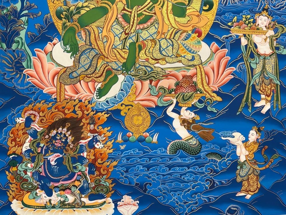 This thangka of Green Tara has real gold painted on its surface along with other paints. This is an ancient process of decorating the thangka in Tibetan Buddhism, Here gold is ground into gold dust, which is then mixed with other undisclosed material to make it paintable on the canvas. this mixture is then mixed with transparent glue and painted on the thangka. Read More