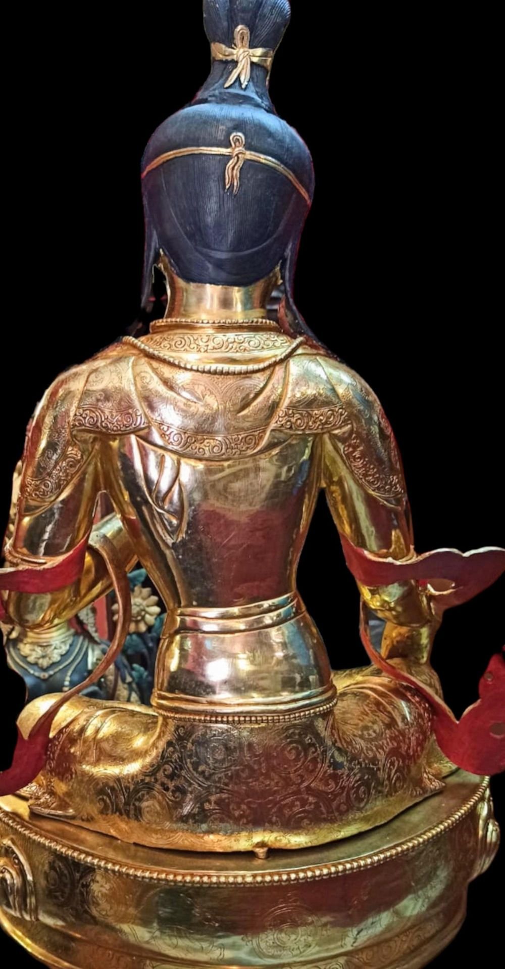 This Green Tara is finished with full gold plating. also known as mercury gold plating or fire gold plating. This traditional technique involves the application of a genuine layer of gold onto the Green Tara. Referred to as mercury gold plating, it is considered the correct and authentic form of gold plating in Nepal. Despite being more expensive than electroplating, this traditional mercury gold plating is gaining popularity again in Nepal. People are drawn to its authenticity, longevity, and the unmatched beauty it brings to the Green Tara. The resurgence of interest in this traditional form of gold plating reflects a growing appreciation for the craftsmanship and cultural heritage of Nepal Read More