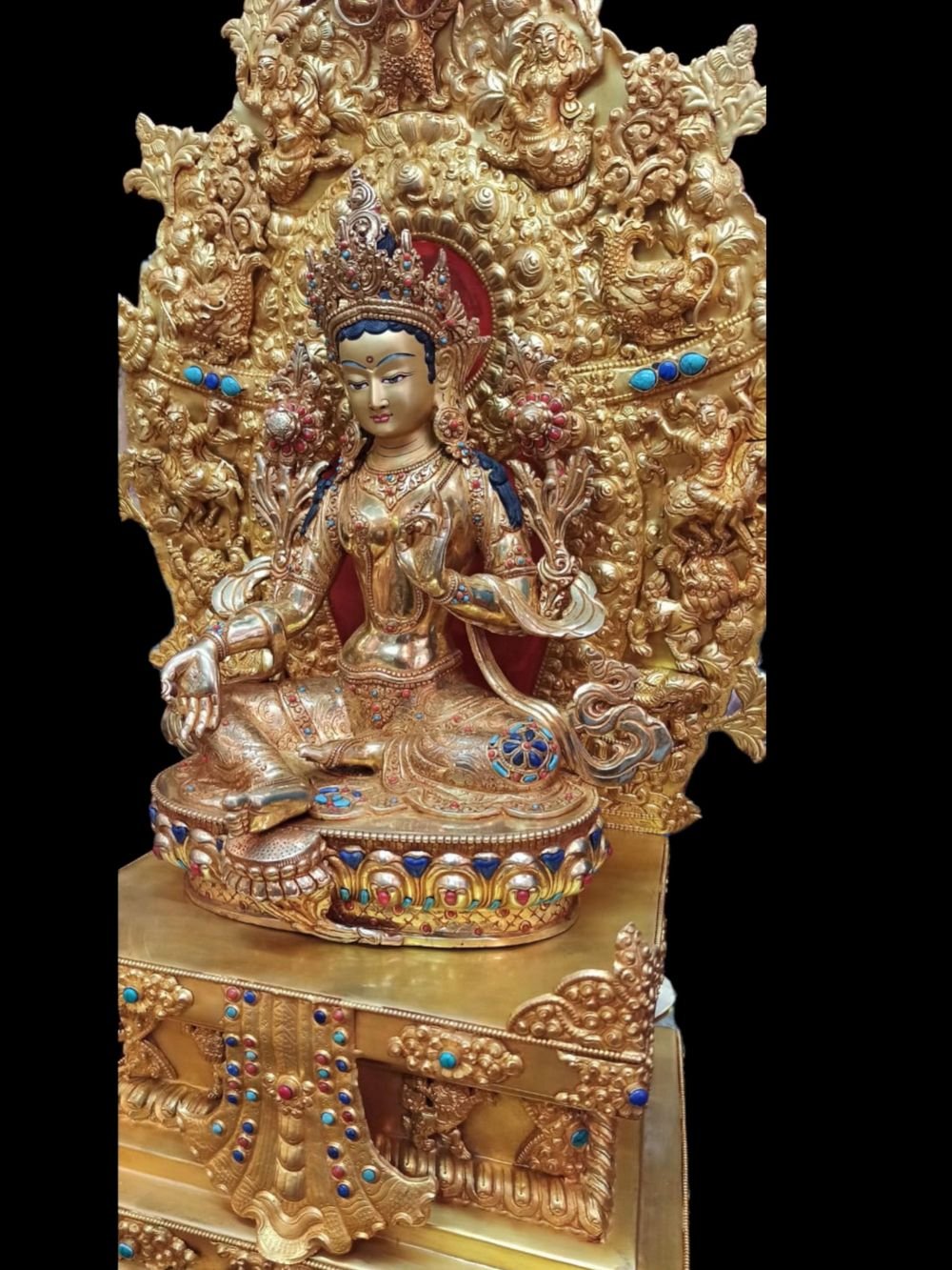 This Green Tara is finished with full gold plating. also known as mercury gold plating or fire gold plating. This traditional technique involves the application of a genuine layer of gold onto the Green Tara. Referred to as mercury gold plating, it is considered the correct and authentic form of gold plating in Nepal. Despite being more expensive than electroplating, this traditional mercury gold plating is gaining popularity again in Nepal. People are drawn to its authenticity, longevity, and the unmatched beauty it brings to the Green Tara. The resurgence of interest in this traditional form of gold plating reflects a growing appreciation for the craftsmanship and cultural heritage of Nepal Read More