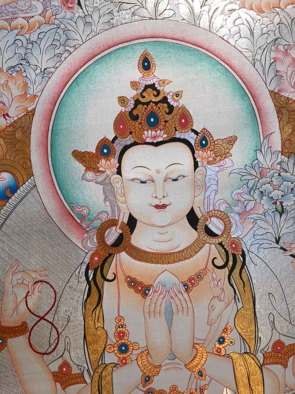 Buddhist Handmade Thangka of Chenrezig, Silver, Hand Painted, Three Great Bodhisattvas , Bodhisattva of Compassion, Protector of All Beings