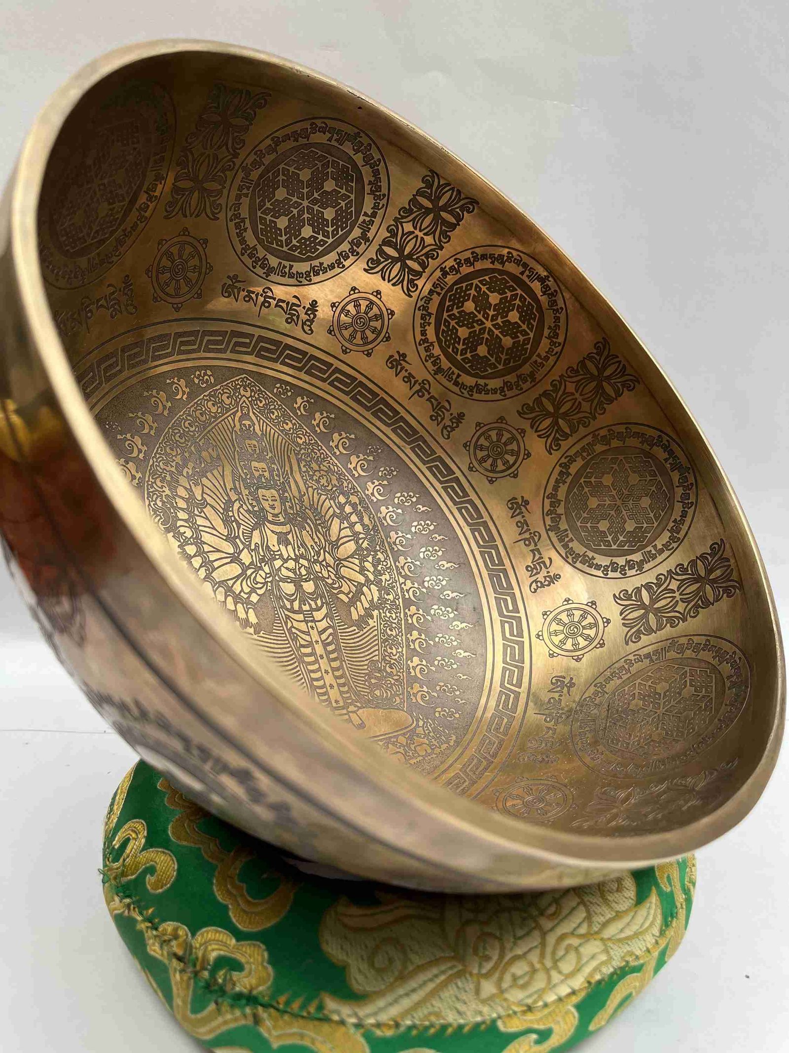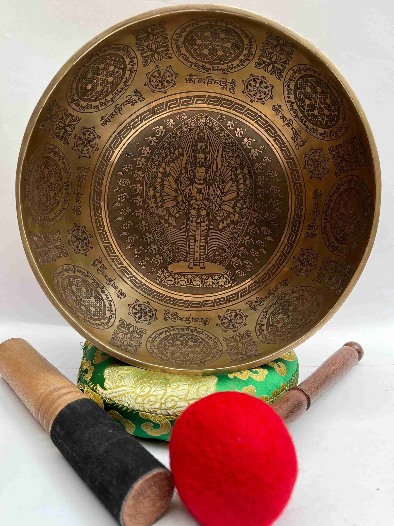 Singing Bowl Buddhist Handmade Jambati with 1000 Armed Avalokiteshvara Design, Fine Carving, Select Accessories , A bowl used for meditation and healing, producing a soothing sound that promotes relaxation and mindfulness