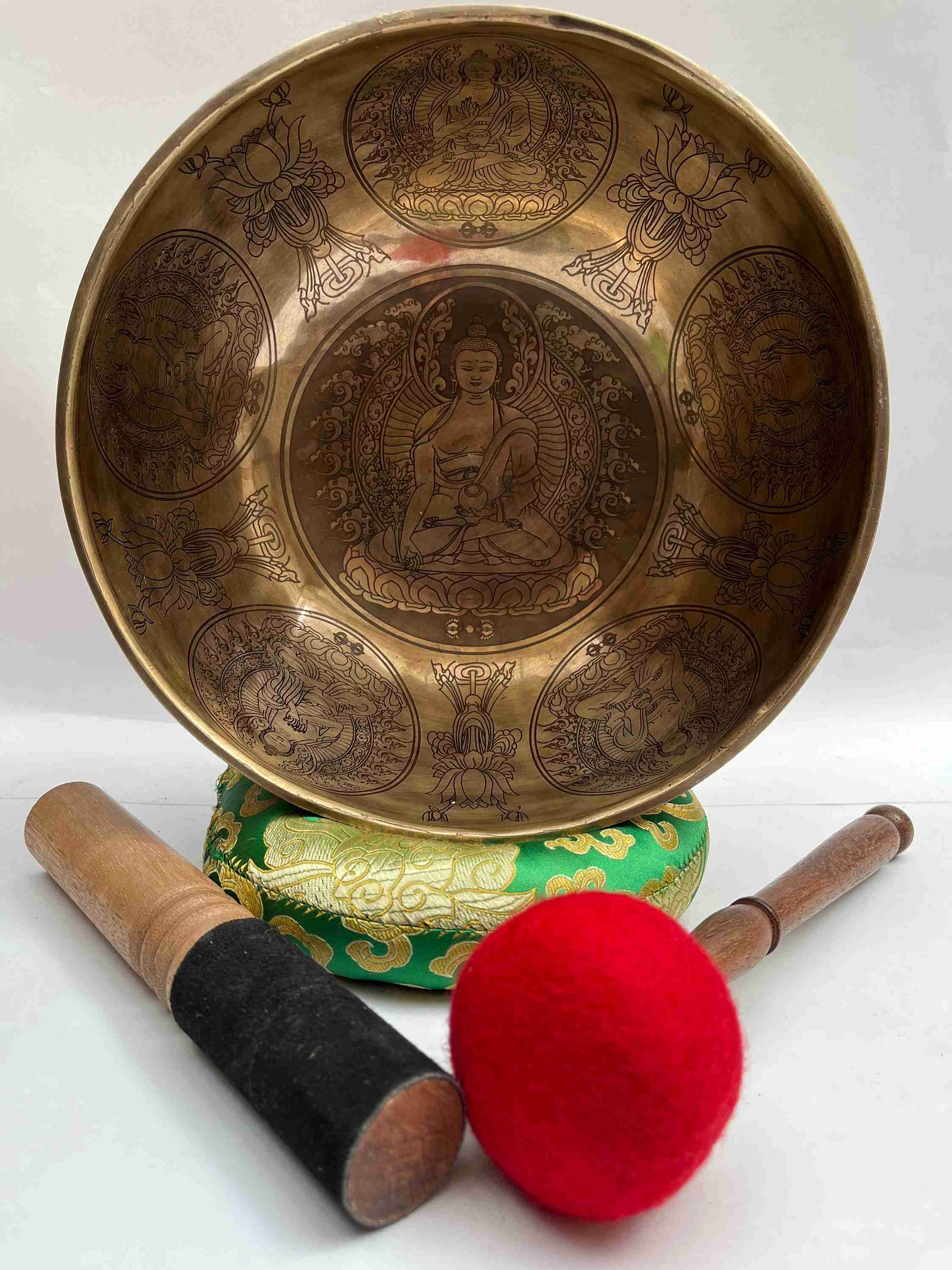 Buddhist Handmade Jambati Singing Bowl with Medicine Buddha Design, Fine Carving, Select Accessories , A bowl used for meditation and healing, producing a soothing sound that promotes relaxation and mindfulness