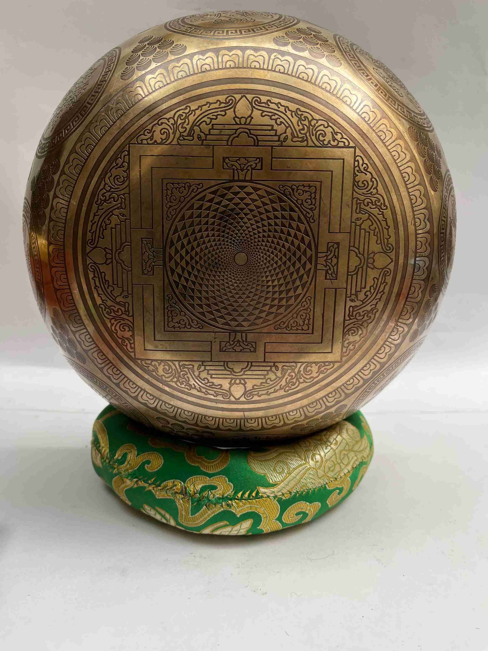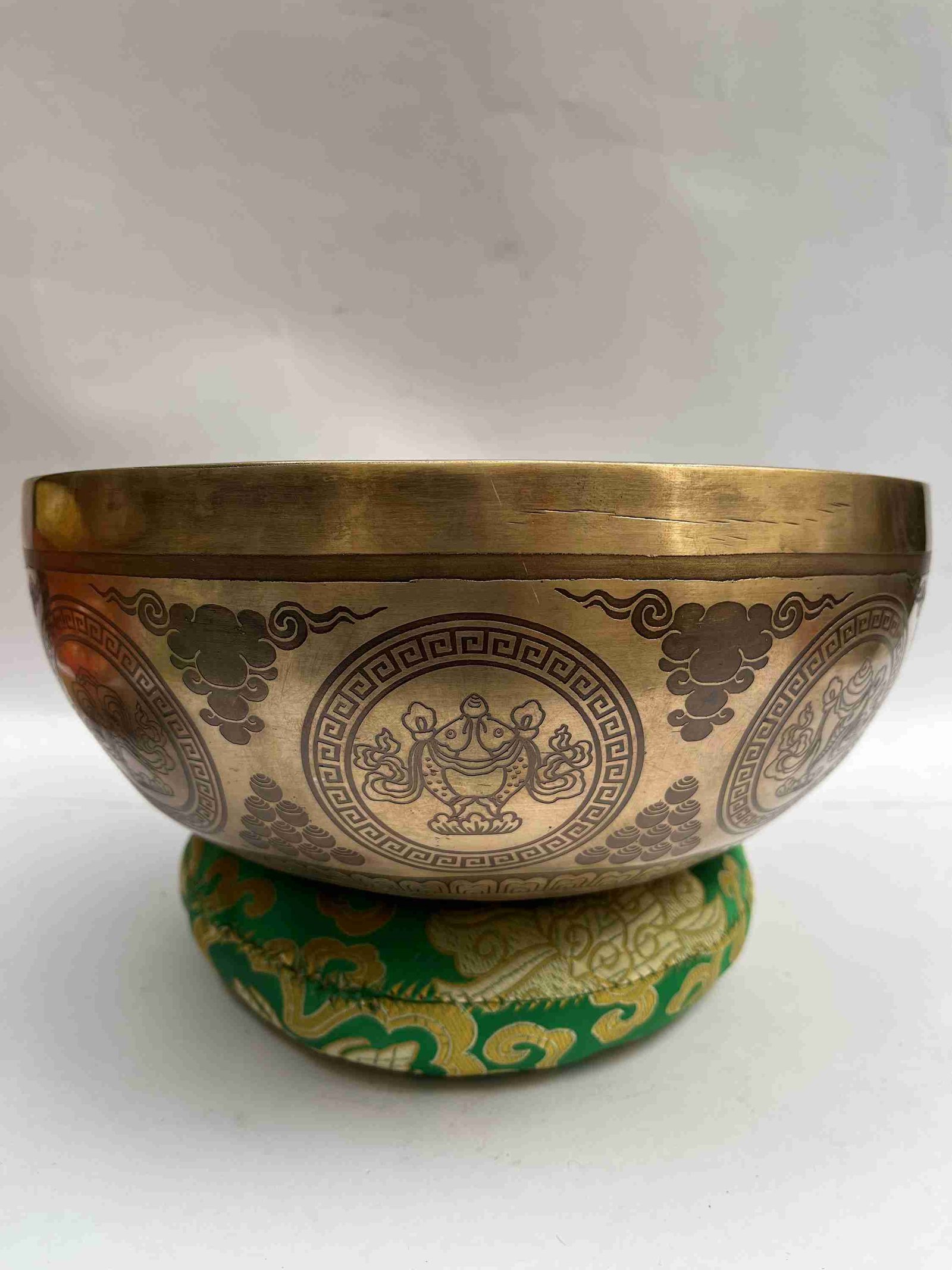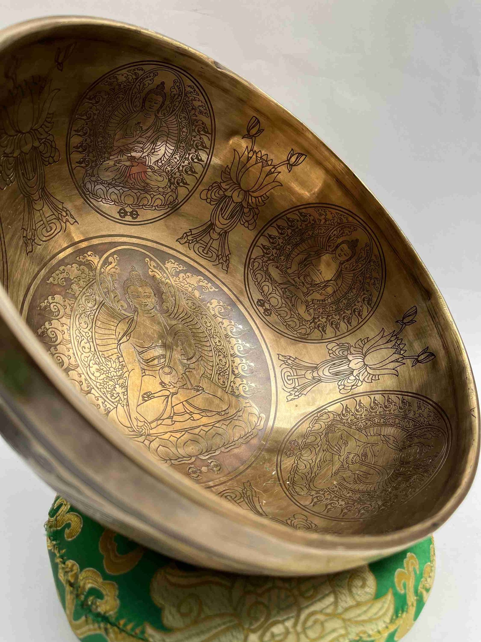 This Singing Bowl has a very high quality of etching and carving, with the normal etching and carving you may have noticed that the lines are very are they are painted with a thicker brush hence the lines are thicker. But for this Singing Bowl, we have assigned a fine artist of thangka painting to do the drawing for us. hence the lines are dinner and well detailed.