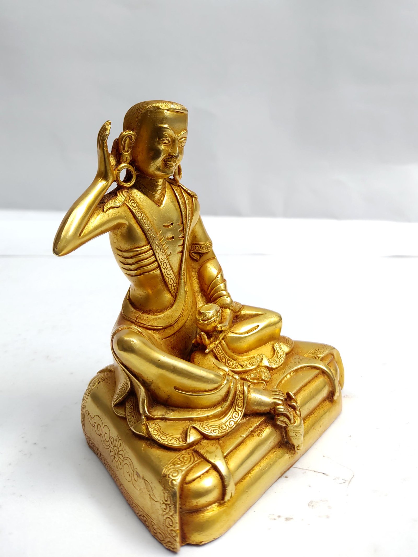 This Milarepa is finished with full gold plating. also known as mercury gold plating or fire gold plating. This traditional technique involves the application of a genuine layer of gold onto the Milarepa. Referred to as mercury gold plating, it is considered the correct and authentic form of gold plating in Nepal. Despite being more expensive than electroplating, this traditional mercury gold plating is gaining popularity again in Nepal. People are drawn to its authenticity, longevity, and the unmatched beauty it brings to the Milarepa. The resurgence of interest in this traditional form of gold plating reflects a growing appreciation for the craftsmanship and cultural heritage of Nepal Read More