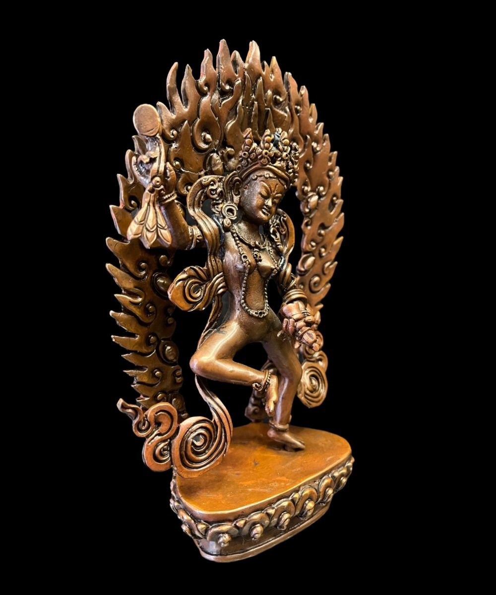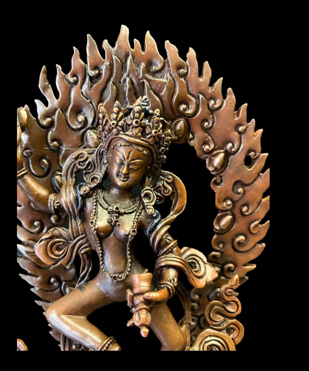 This Machig Labdron has been meticulously treated with a chocolate color antique patina. The intention behind this patina is to replicate the appearance of a copper statue that has gracefully aged over a century. Unlike a simple coat of paint, this patina is not applied superficially and is designed to endure. It undergoes an artificial oxidation process that adds depth and character, while also serving as a protective layer against natural oxidation.