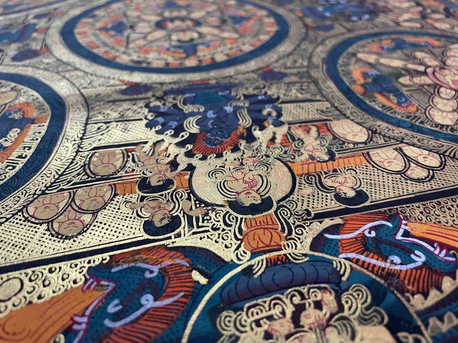 This thangka of Mandala has real gold painted on its surface along with other paints. This is an ancient process of decorating the thangka in Tibetan Buddhism, Here gold is ground into gold dust, which is then mixed with other undisclosed material to make it paintable on the canvas. this mixture is then mixed with transparent glue and painted on the thangka. Read More