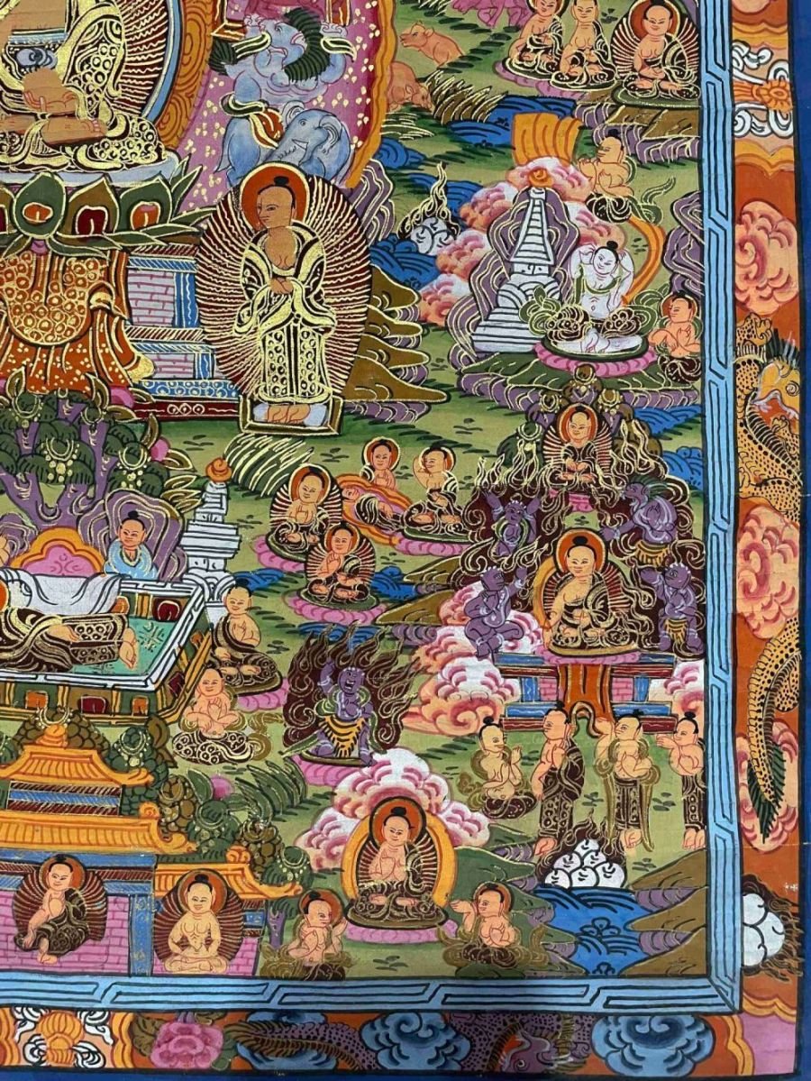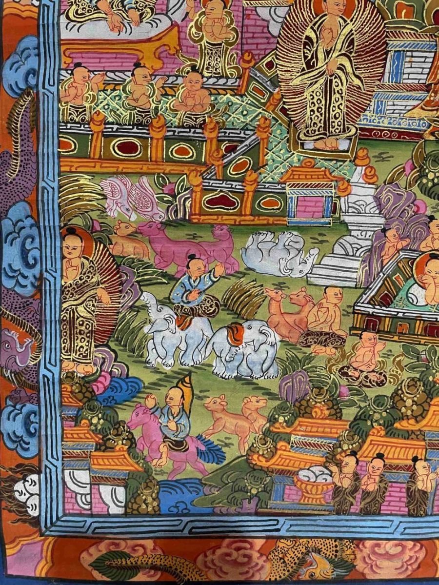 This thangka of Buddha Life Story has real gold painted on its surface along with other paints. This is an ancient process of decorating the thangka in Tibetan Buddhism, Here gold is ground into gold dust, which is then mixed with other undisclosed material to make it paintable on the canvas. this mixture is then mixed with transparent glue and painted on the thangka. Read More