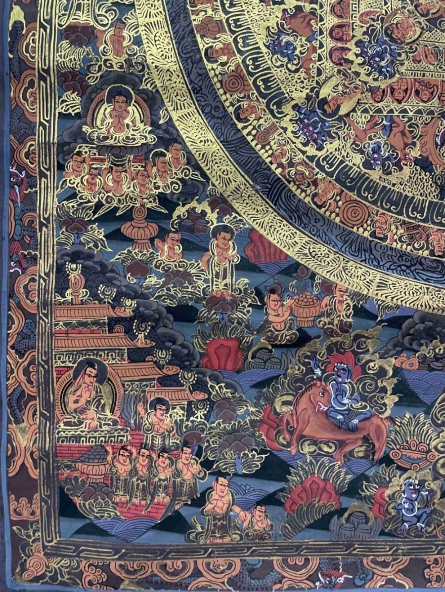 Mandala Thangka painting is a revered form of sacred art in Buddhism, characterized by intricate and vibrant depictions on cotton or silk. These paintings often feature a central deity or Buddha figure surrounded by meticulously crafted symmetrical patterns, geometric designs, and symbolic elements. Mandala Thangkas serve as visual aids for meditation and spiritual growth, guiding practitioners towards inner peace, harmony, and enlightenment. Through their precise brushwork and rich symbolism, these artworks invite viewers to contemplate the profound spiritual journey within themselves, fostering mindfulness, concentration, and a deeper connection with the universal truths of Buddhism. Read More