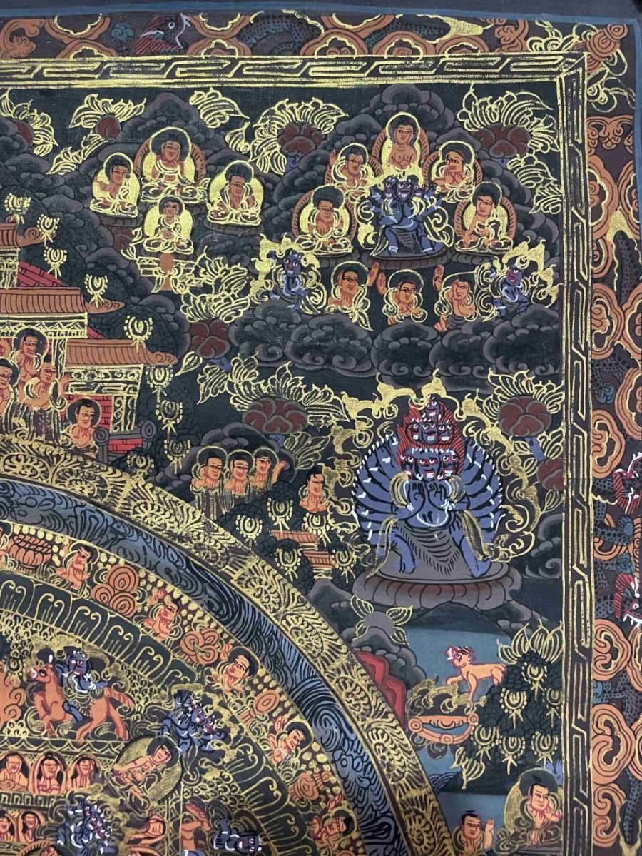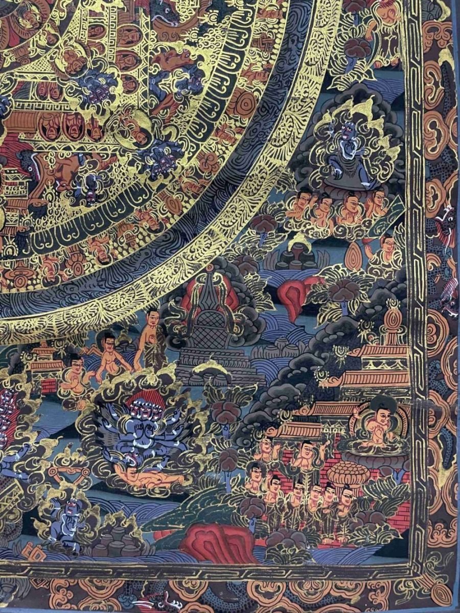This thangka of Mandala has real gold painted on its surface along with other paints. This is an ancient process of decorating the thangka in Tibetan Buddhism, Here gold is ground into gold dust, which is then mixed with other undisclosed material to make it paintable on the canvas. this mixture is then mixed with transparent glue and painted on the thangka. Read More