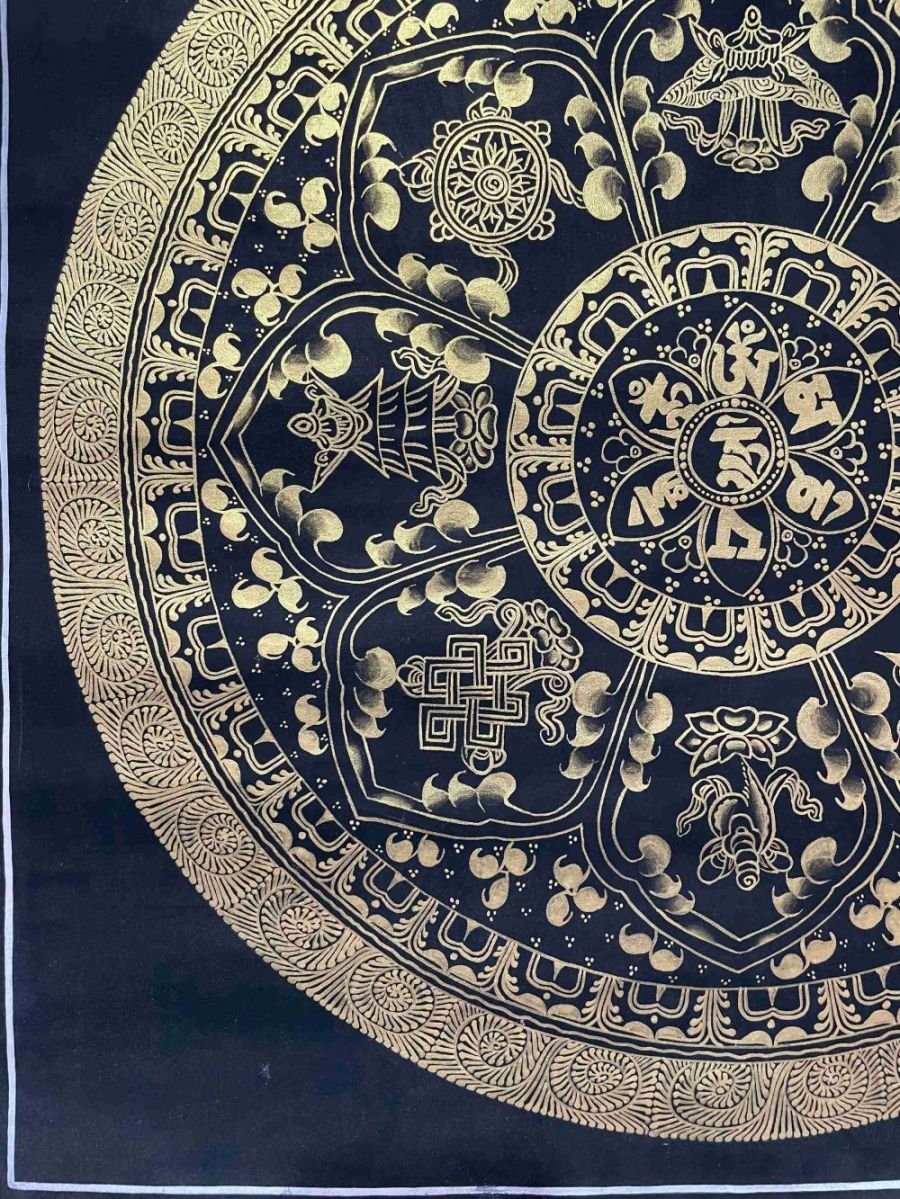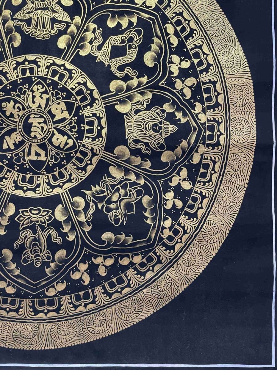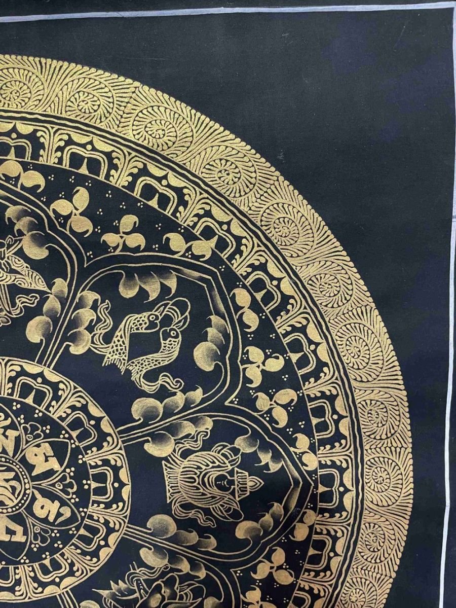 This thangka of Mantra Mandala has real gold painted on its surface along with other paints. This is an ancient process of decorating the thangka in Tibetan Buddhism, Here gold is ground into gold dust, which is then mixed with other undisclosed material to make it paintable on the canvas. this mixture is then mixed with transparent glue and painted on the thangka. Read More