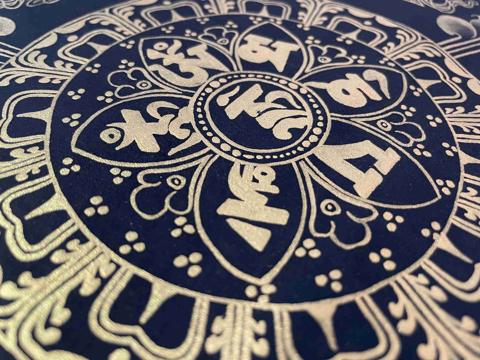OM MANI PADME HUM is also inscribed in Mandala paintings. Those kinds of mandala have OM MANI PADME HUM in a circular fashion, and mantras are painted in concentric circles from the surface to the center of the circle. They come under the categories of the Mantra Mandala. These mandalas are usually found hanging on the walls of Buddhist monasteries and are often used in meditation halls for focus and concentration purposes.