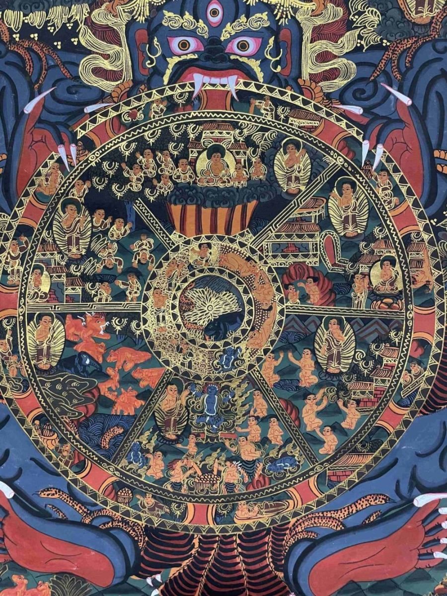 The outer rim of the wheel is divided into twelve sections that represent the Twelve Links of Dependent Origination.