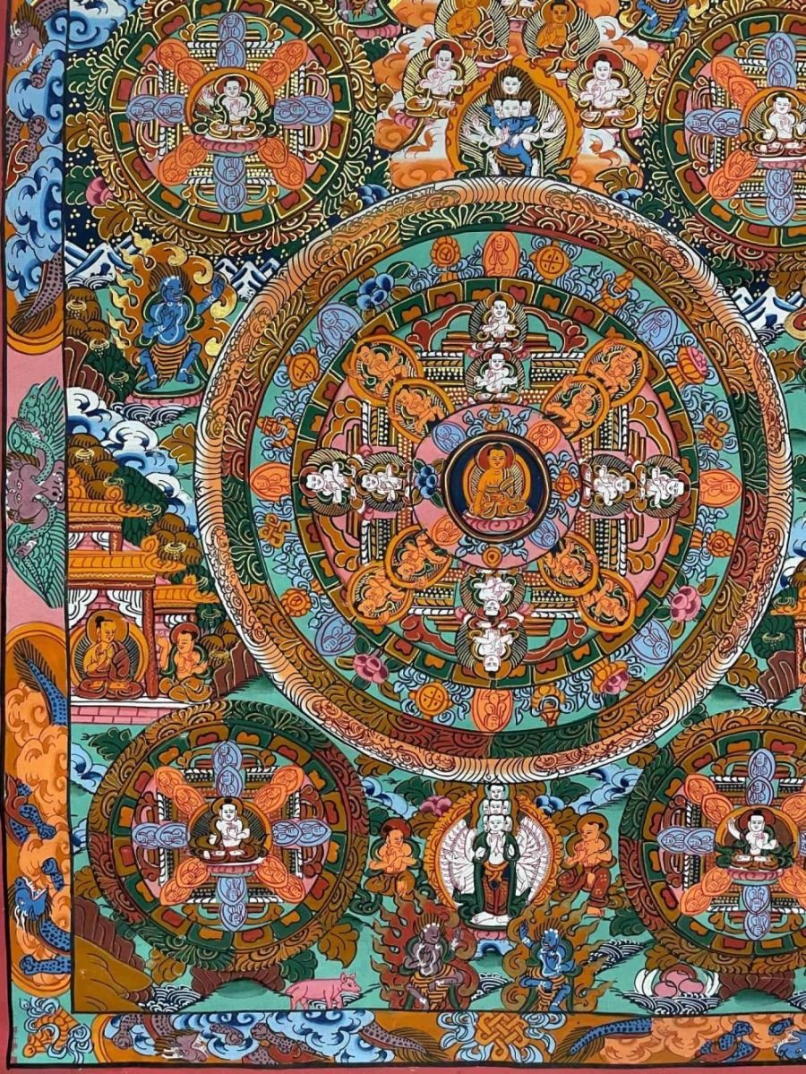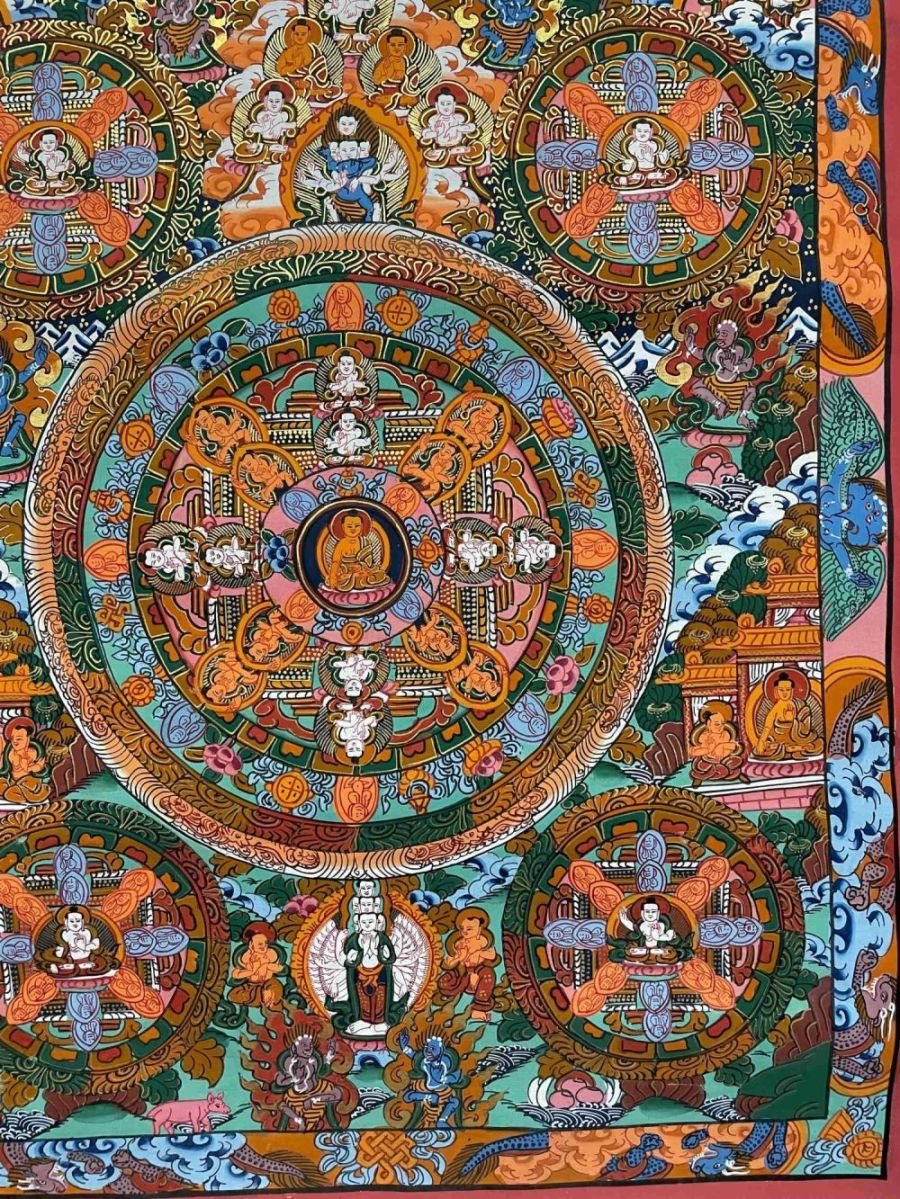A thangka, also known as tangka, thanka, or tanka, is a vibrant and intricate Tibetan Buddhist painting that serves as a visual representation of spiritual teachings. Crafted with meticulous detail on cotton or silk appliqué, thangkas depict a wide range of subjects including Buddhist deities, sacred scenes, mandalas, and narrative stories. These sacred artworks are traditionally kept unframed and rolled up for storage, resembling ancient scrolls. To protect their delicate nature, thangkas are mounted on textile backings and often adorned with a silk cover on the front. Proper preservation in dry environments is crucial to maintain the integrity and longevity of the silk. Read More