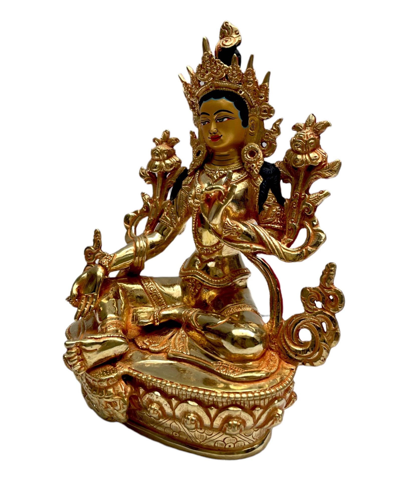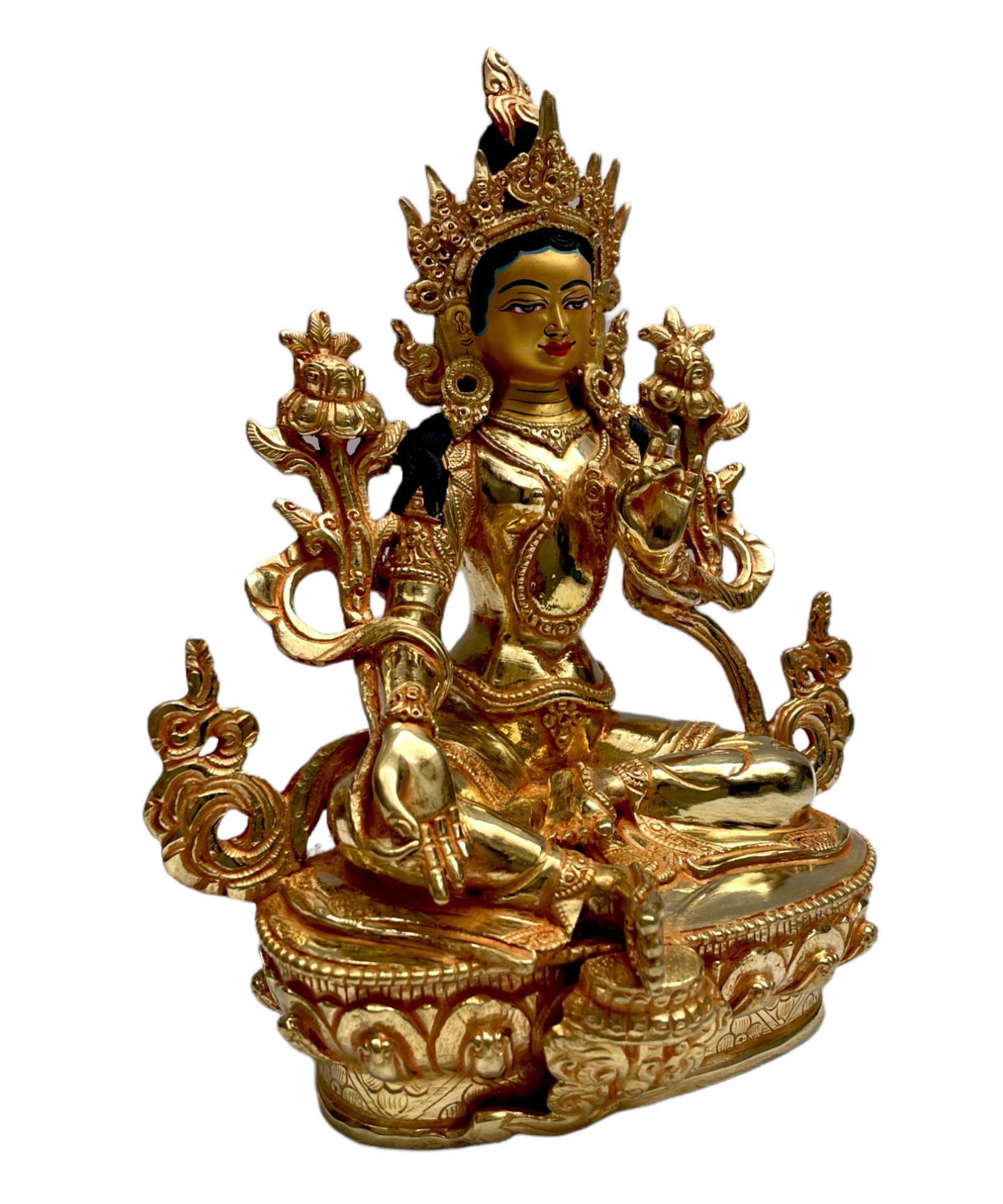 Buddhist Statue of Green Tara, Full Fire Gold Plated, with Painted Face , Goddess of Compassion, Protection, and Swift Action