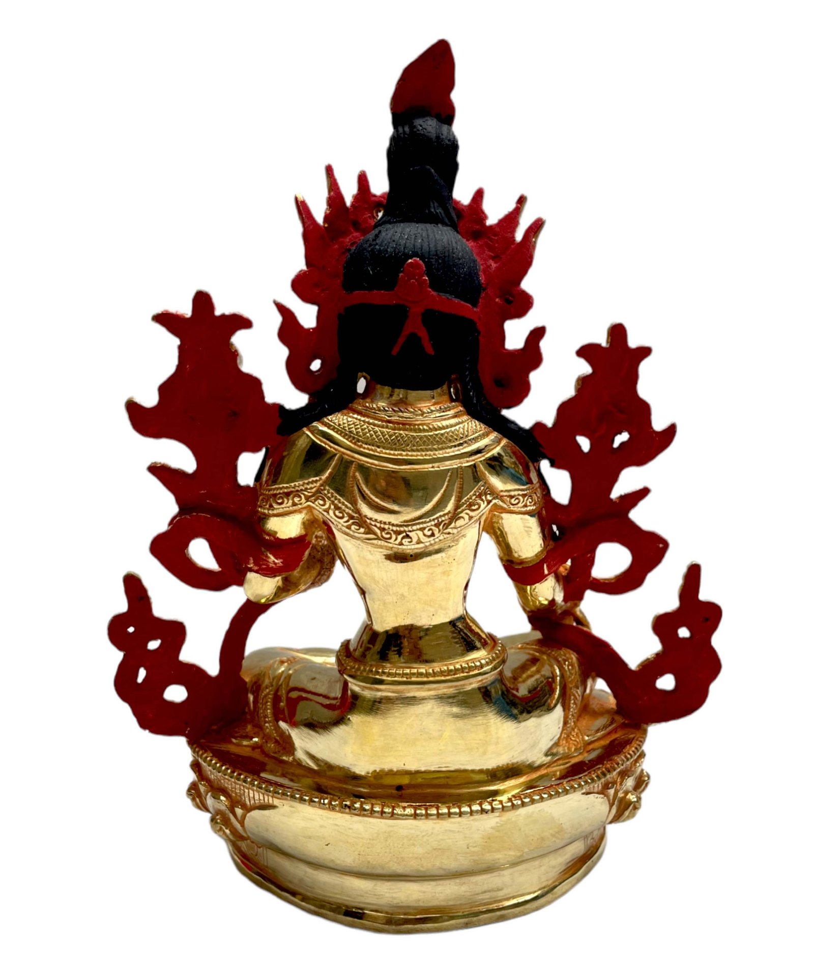 This Green Tara is finished with full gold plating. also known as mercury gold plating or fire gold plating. This traditional technique involves the application of a genuine layer of gold onto the Green Tara. Referred to as mercury gold plating, it is considered the correct and authentic form of gold plating in Nepal. Despite being more expensive than electroplating, this traditional mercury gold plating is gaining popularity again in Nepal. People are drawn to its authenticity, longevity, and the unmatched beauty it brings to the Green Tara. The resurgence of interest in this traditional form of gold plating reflects a growing appreciation for the craftsmanship and cultural heritage of Nepal Read More