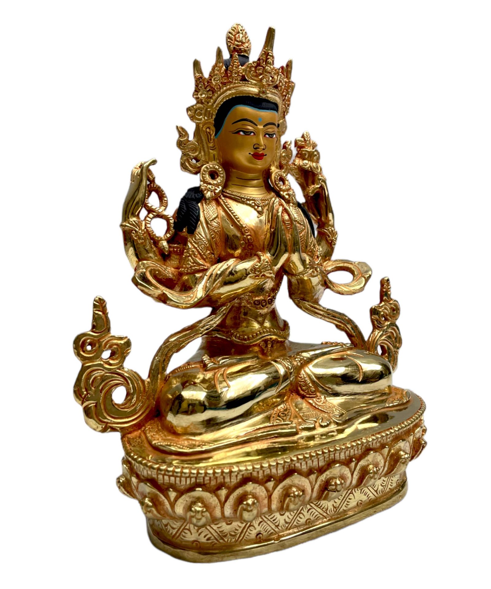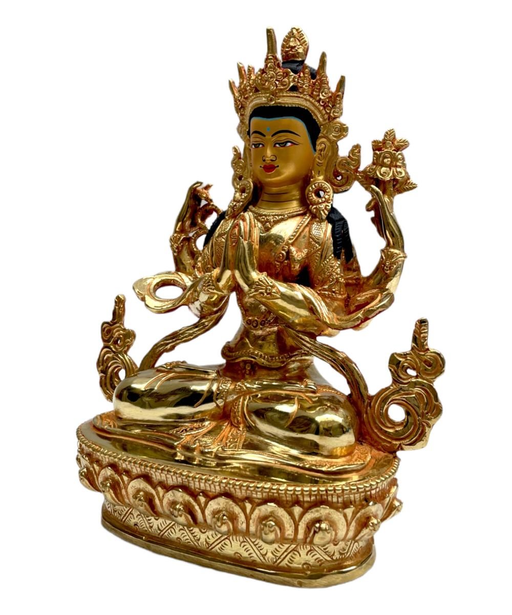 Buddhist Statue of Chenrezig, Full Fire Gold Plated, with Painted Face , Bodhisattva of Compassion, Protector of All Beings