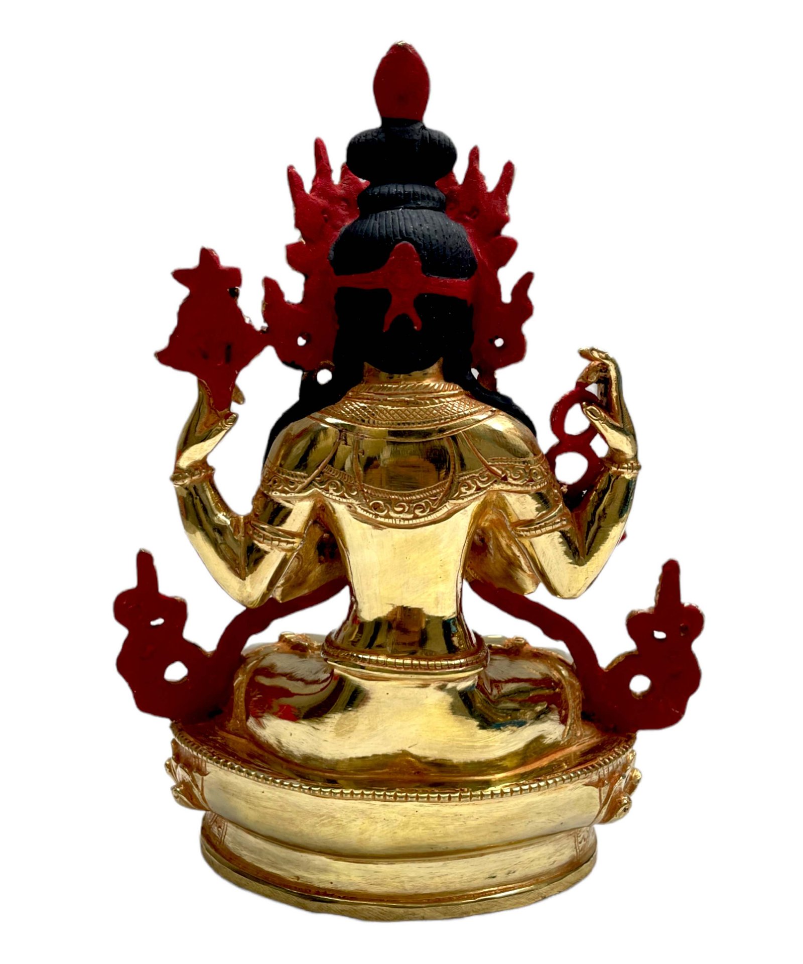 This Chenrezig is finished with full gold plating. also known as mercury gold plating or fire gold plating. This traditional technique involves the application of a genuine layer of gold onto the Chenrezig. Referred to as mercury gold plating, it is considered the correct and authentic form of gold plating in Nepal. Despite being more expensive than electroplating, this traditional mercury gold plating is gaining popularity again in Nepal. People are drawn to its authenticity, longevity, and the unmatched beauty it brings to the Chenrezig. The resurgence of interest in this traditional form of gold plating reflects a growing appreciation for the craftsmanship and cultural heritage of Nepal Read More