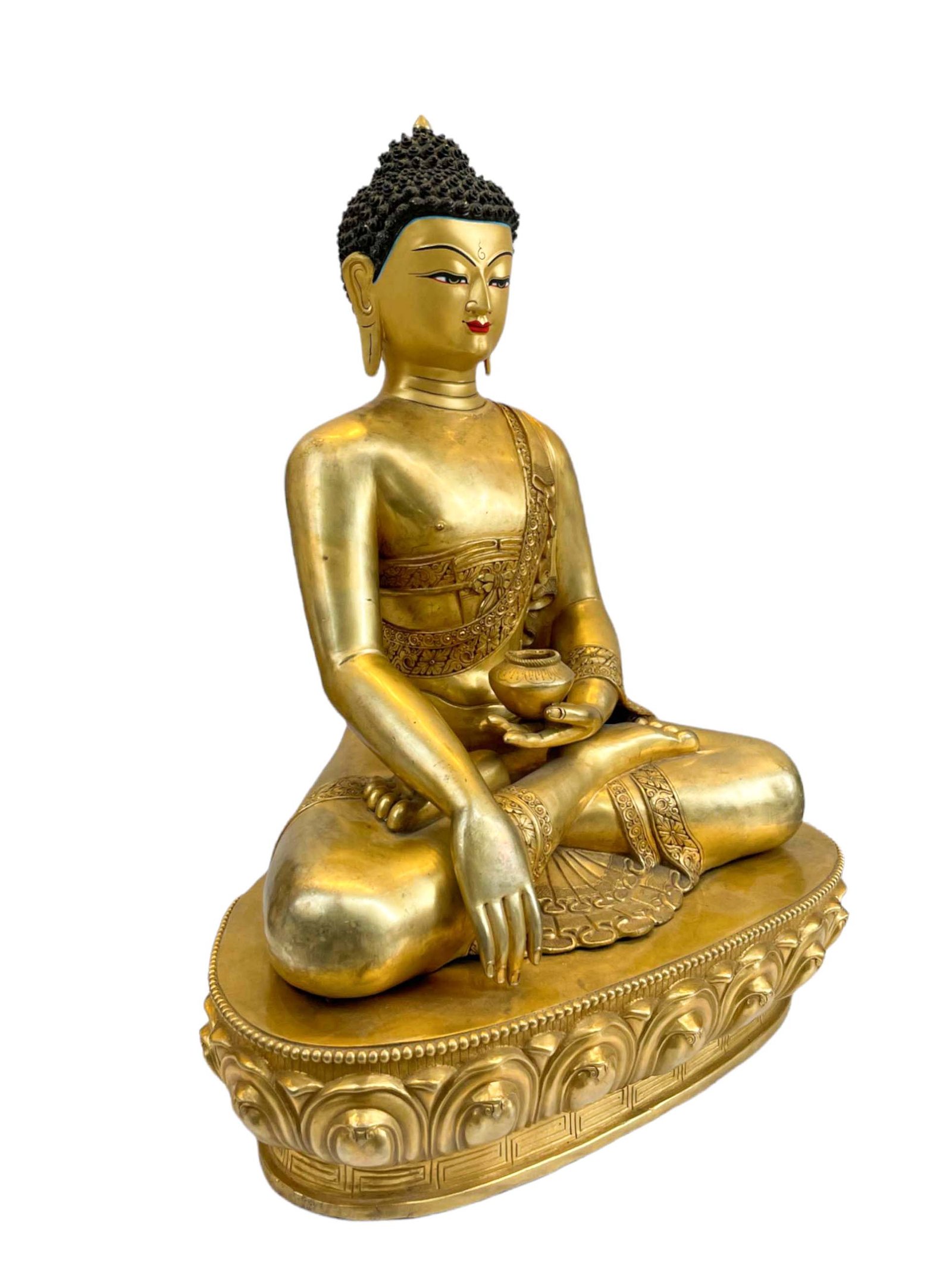 This Shakyamuni Buddha is finished with full gold plating. also known as mercury gold plating or fire gold plating. This traditional technique involves the application of a genuine layer of gold onto the Shakyamuni Buddha. Referred to as mercury gold plating, it is considered the correct and authentic form of gold plating in Nepal. Despite being more expensive than electroplating, this traditional mercury gold plating is gaining popularity again in Nepal. People are drawn to its authenticity, longevity, and the unmatched beauty it brings to the Shakyamuni Buddha. The resurgence of interest in this traditional form of gold plating reflects a growing appreciation for the craftsmanship and cultural heritage of Nepal Read More