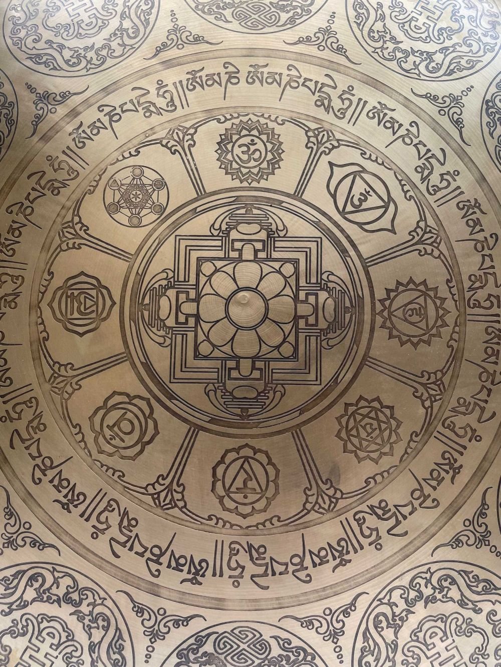 This Wind gong has a very high quality of etching and carving, with the normal etching and carving you may have noticed that the lines are very are they are painted with a thicker brush hence the lines are thicker. But for this Wind gong, we have assigned a fine artist of thangka painting to do the drawing for us. hence the lines are dinner and well detailed.