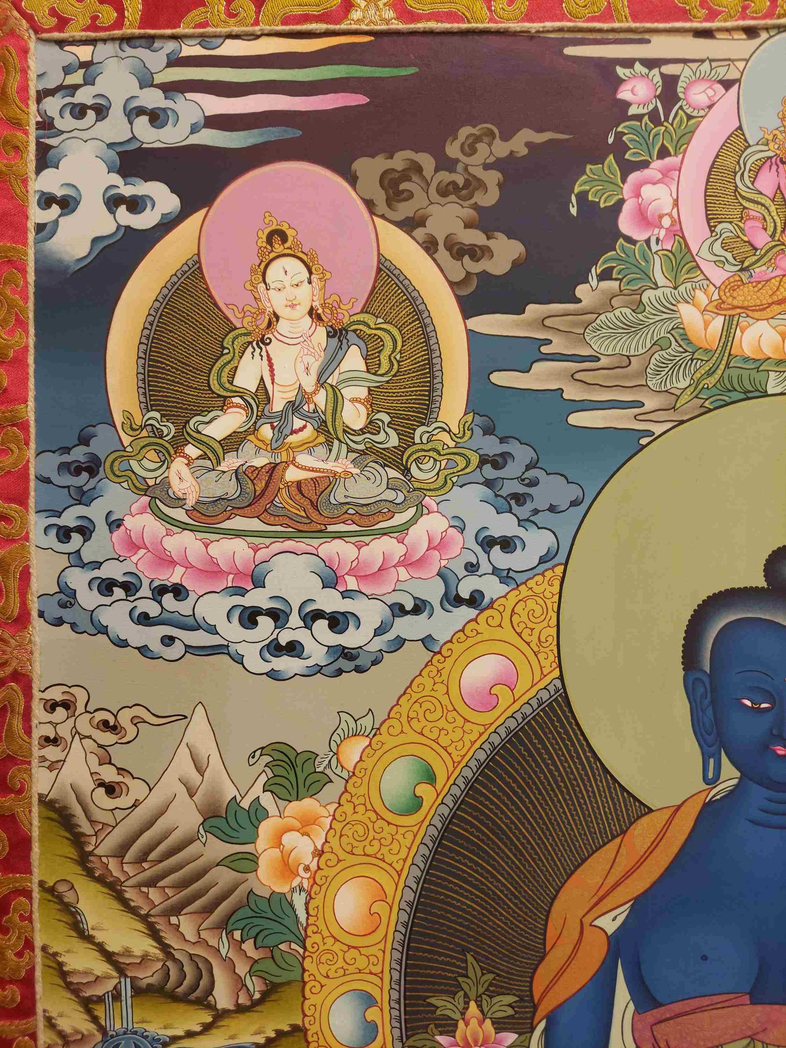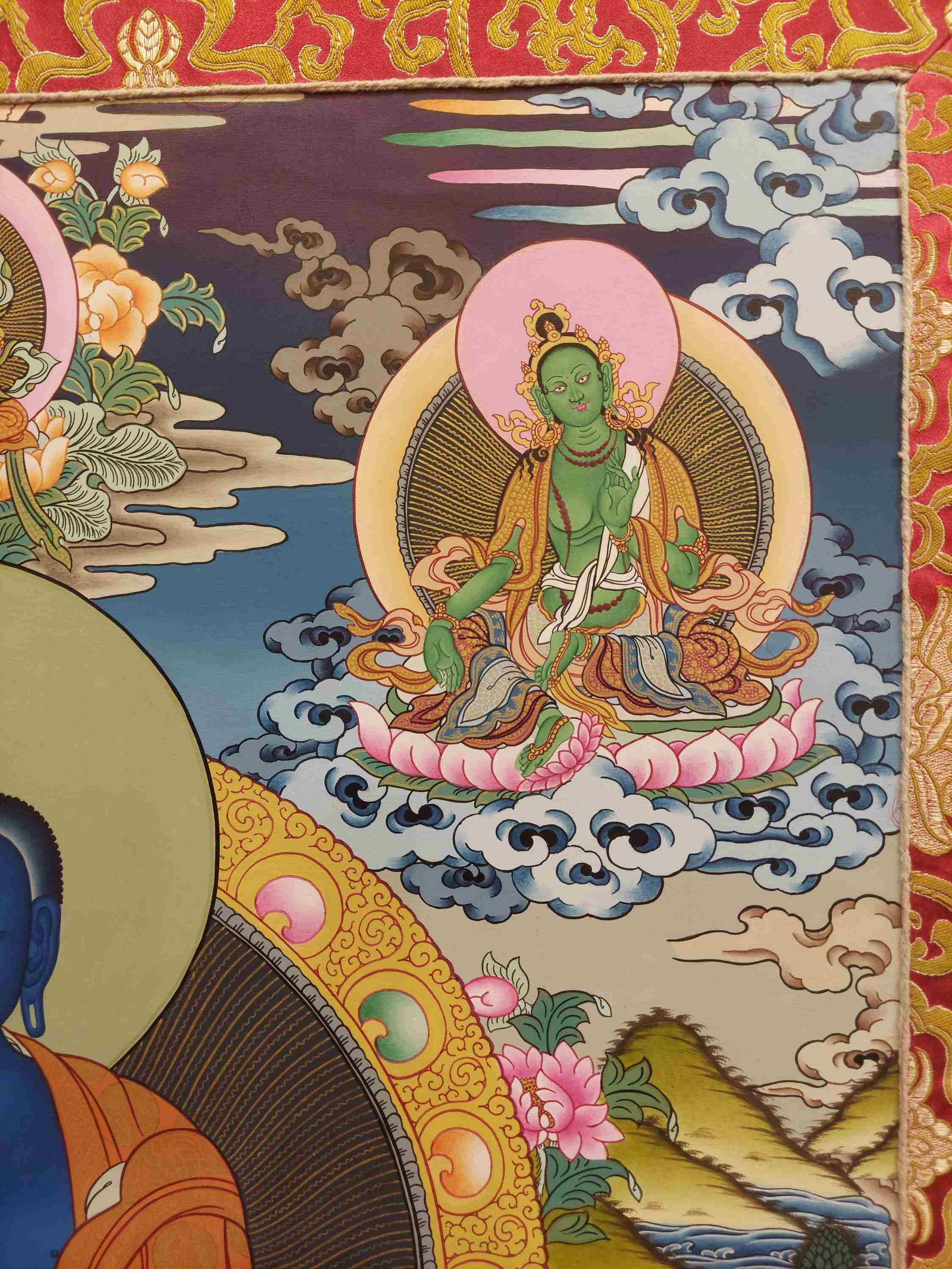 Buddhist Hand Painting Thangka of Medicine Buddha, White Tara, Aparimita and Green Tara On The Top, with Brocade, Hand Painted, Real Gold , Healer of physical and spiritual ailments, bringer of health and peace