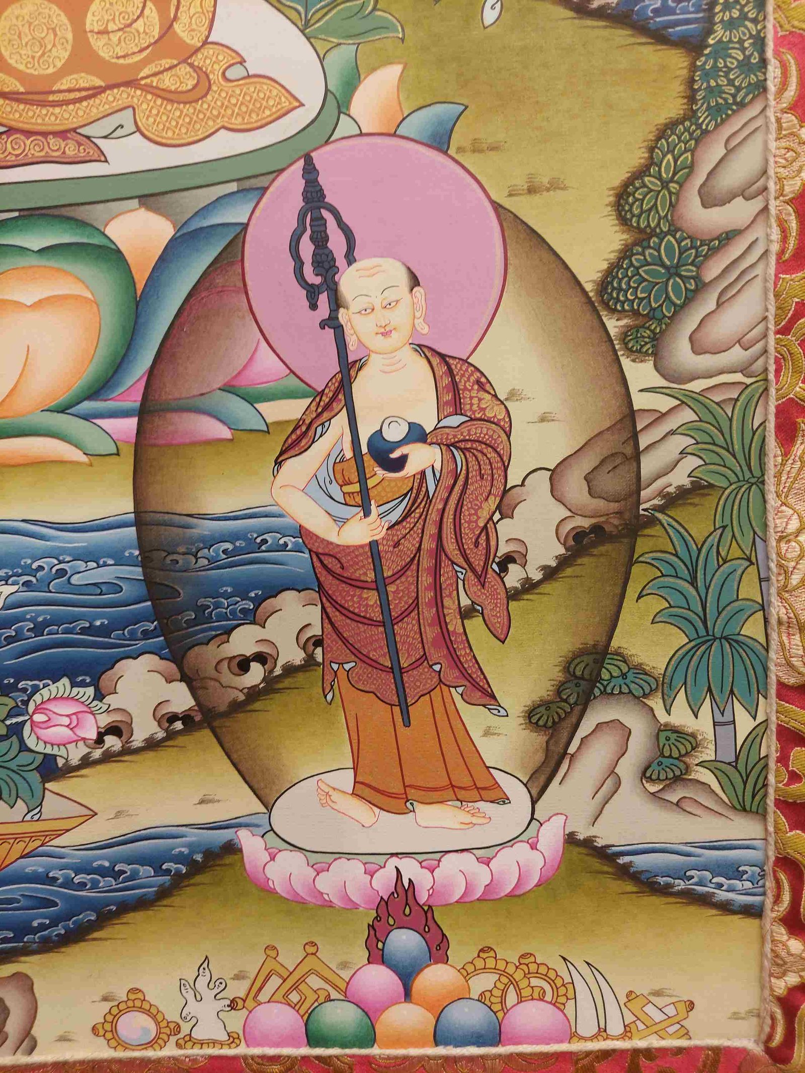 This thangka of Medicine Buddha has real gold painted on its surface along with other paints. This is an ancient process of decorating the thangka in Tibetan Buddhism, Here gold is ground into gold dust, which is then mixed with other undisclosed material to make it paintable on the canvas. this mixture is then mixed with transparent glue and painted on the thangka. Read More