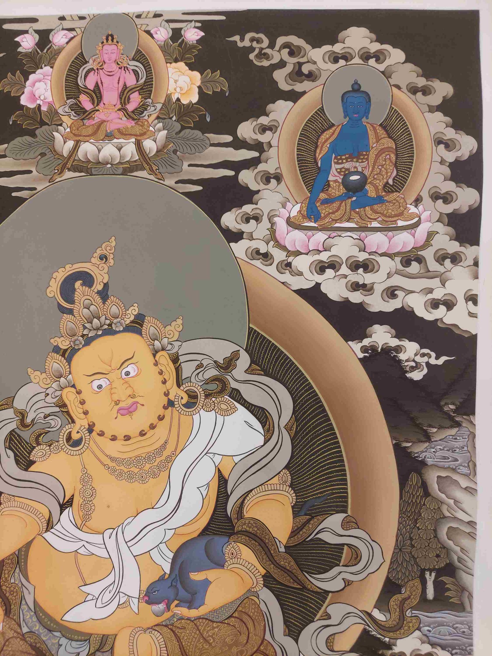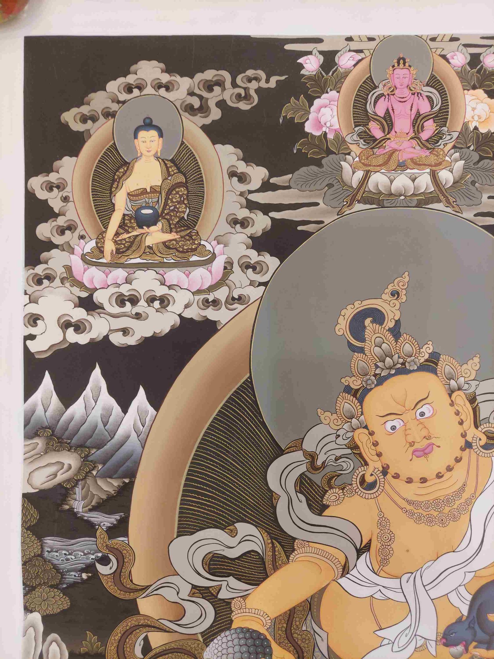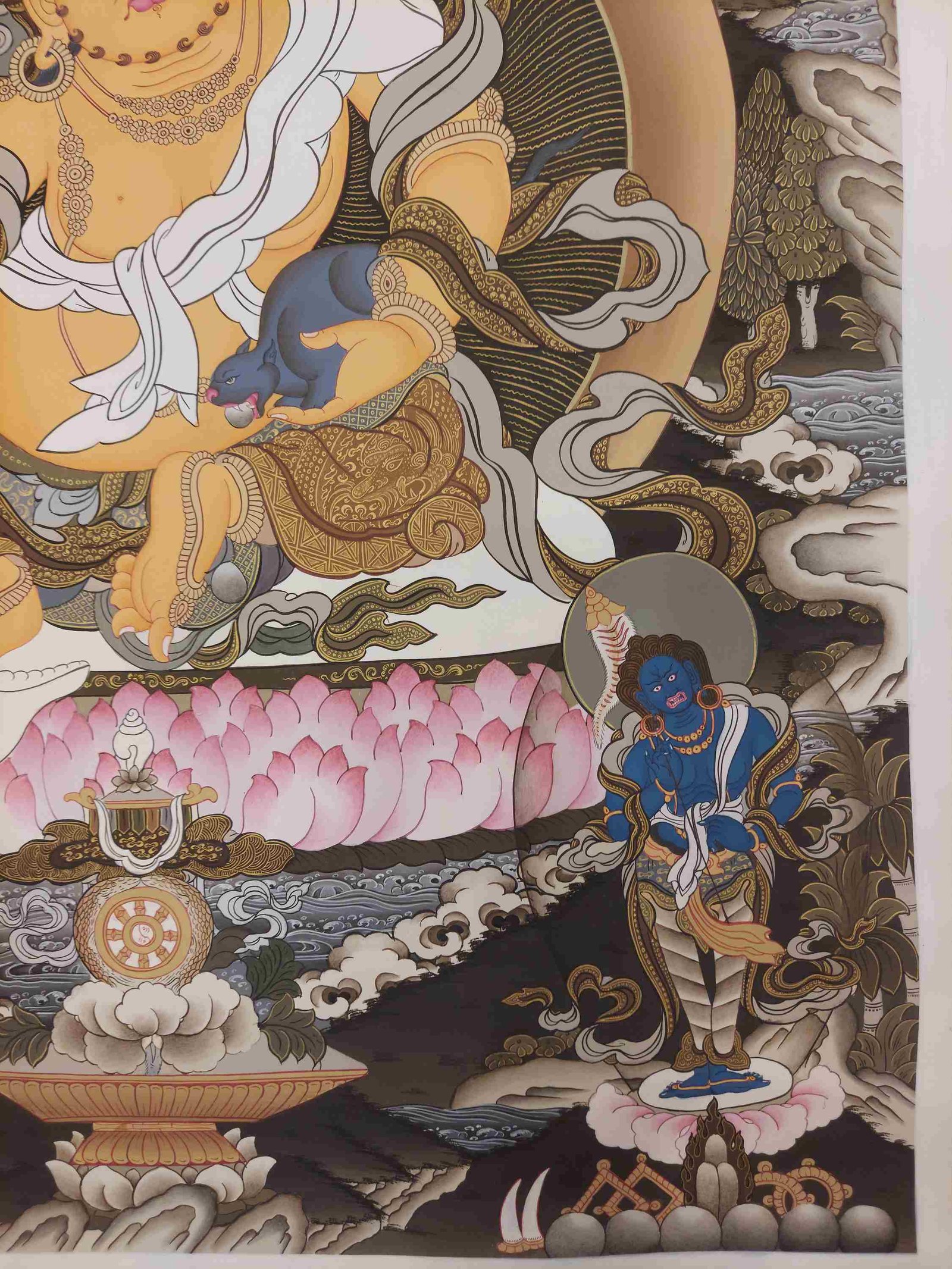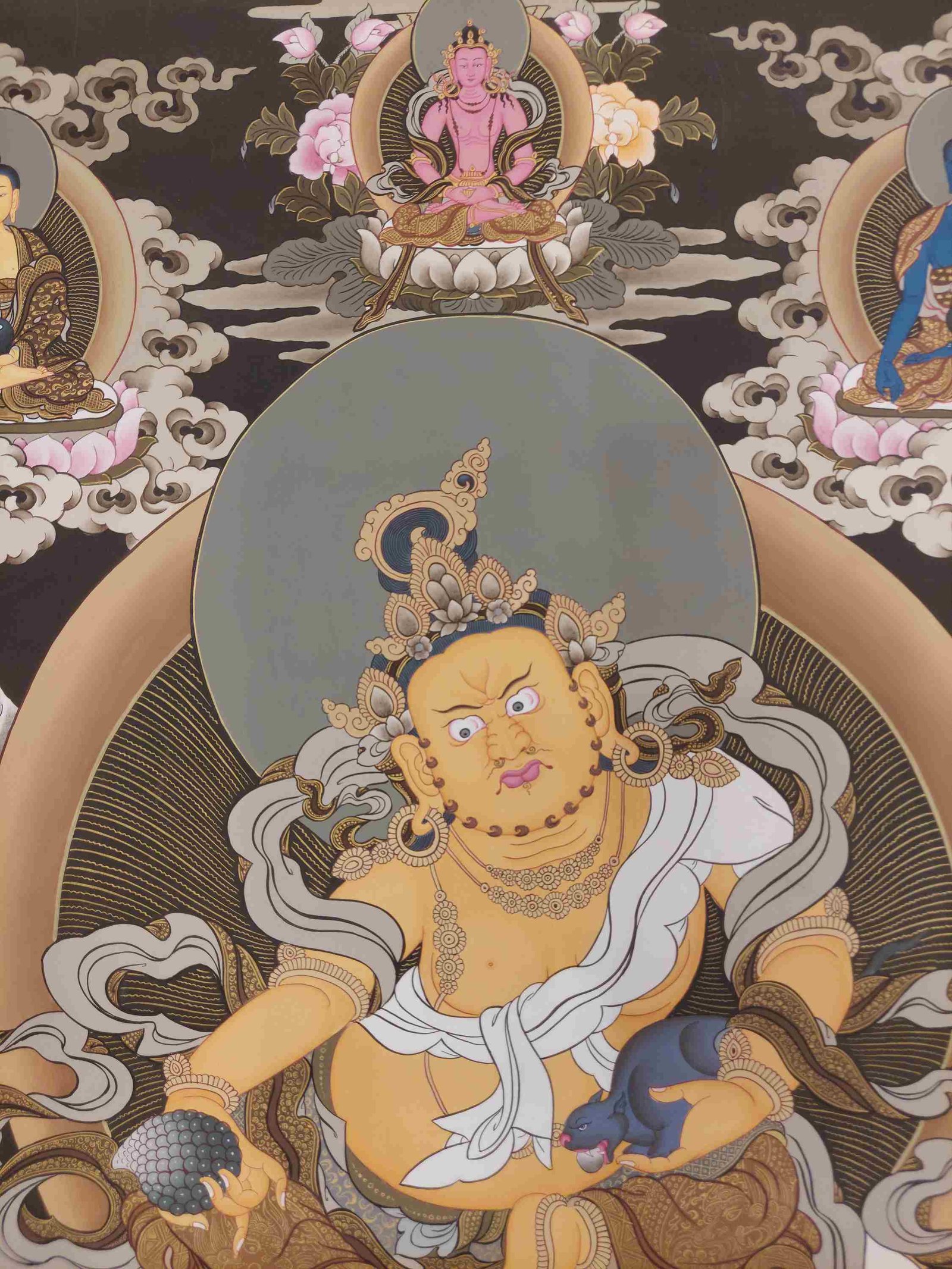Buddhist Hand Painting Thangka of Yellow Jambhala, Shakyamuni Buddha, Aparimita and Ratnasambhava Buddha, Hand Painted, Real Gold, Lamas Art , fostering generosity and abundance