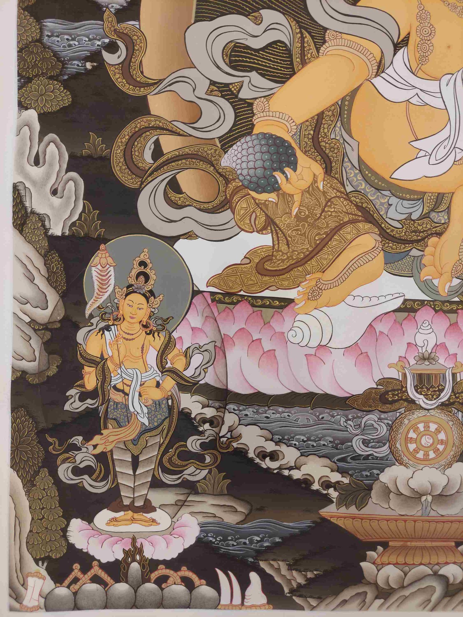 This thangka of Yellow Jambhala has real gold painted on its surface along with other paints. This is an ancient process of decorating the thangka in Tibetan Buddhism, Here gold is ground into gold dust, which is then mixed with other undisclosed material to make it paintable on the canvas. this mixture is then mixed with transparent glue and painted on the thangka. Read More