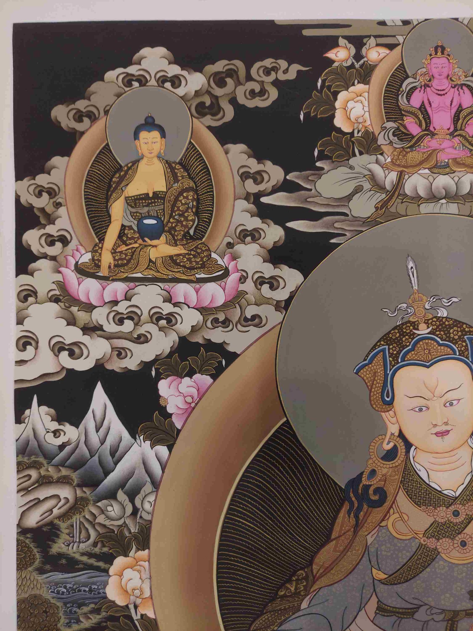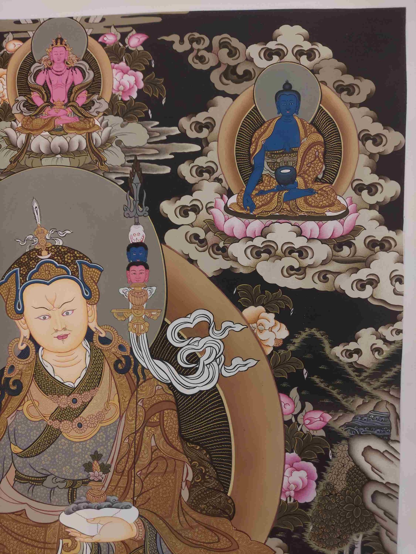Buddhist Hand Painting Thangka of Padmasambhava, Shakyamuni Buddha, Aparimita and Ratnasambhava Buddha, Hand Painted, Real Gold, Lamas Art , The lotus-born master, wisdom beyond time