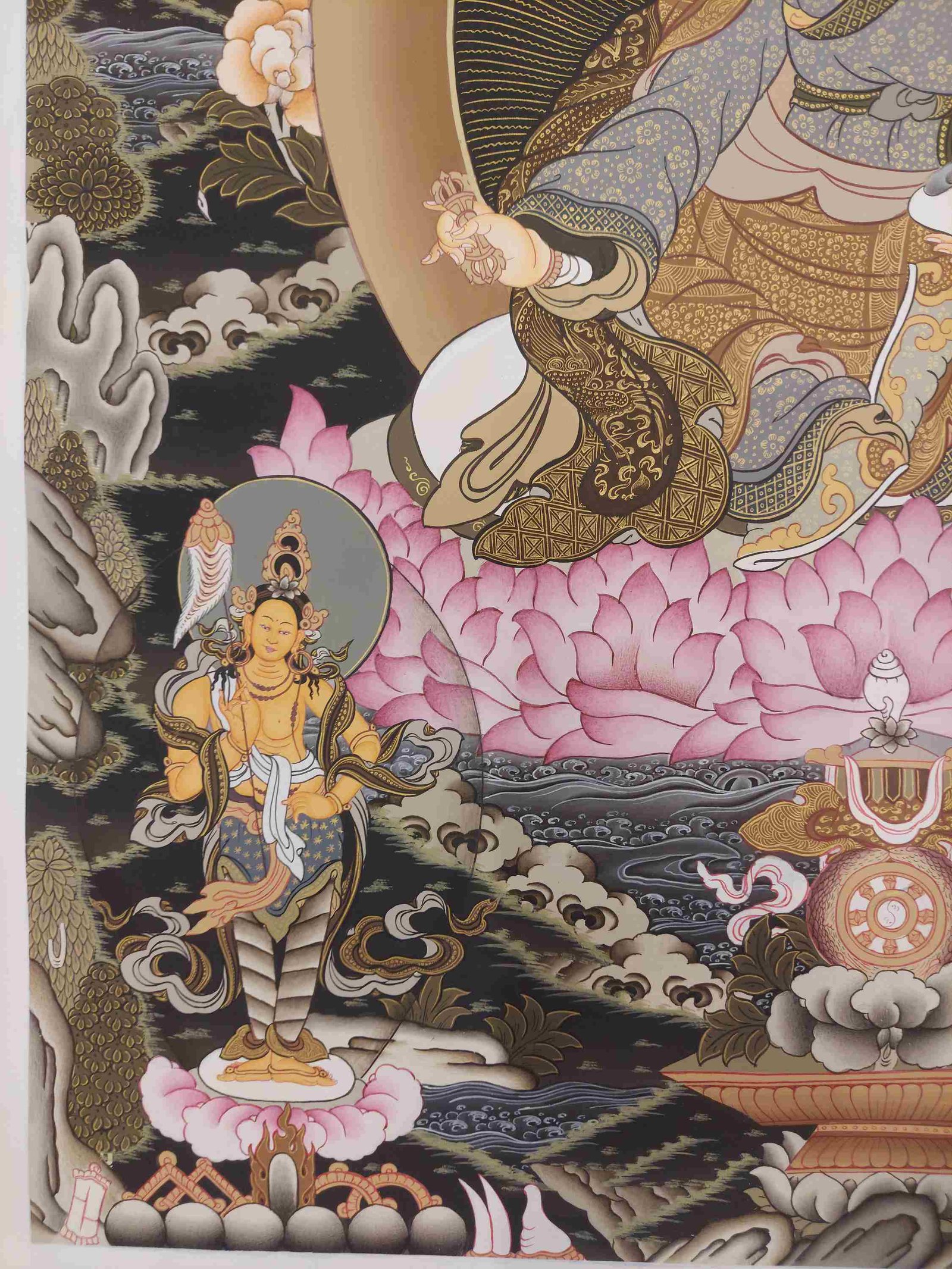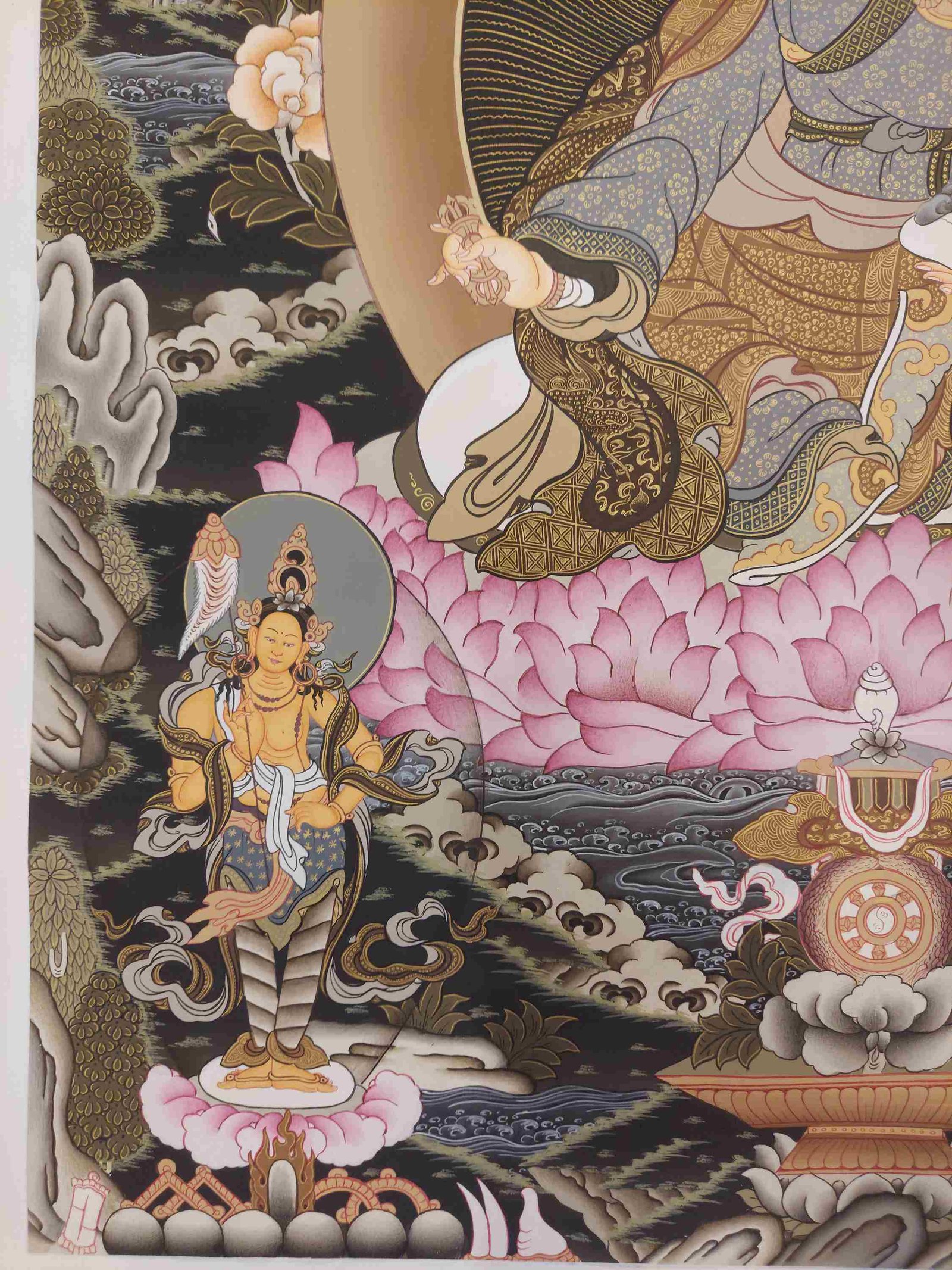 This thangka of Padmasambhava has real gold painted on its surface along with other paints. This is an ancient process of decorating the thangka in Tibetan Buddhism, Here gold is ground into gold dust, which is then mixed with other undisclosed material to make it paintable on the canvas. this mixture is then mixed with transparent glue and painted on the thangka. Read More