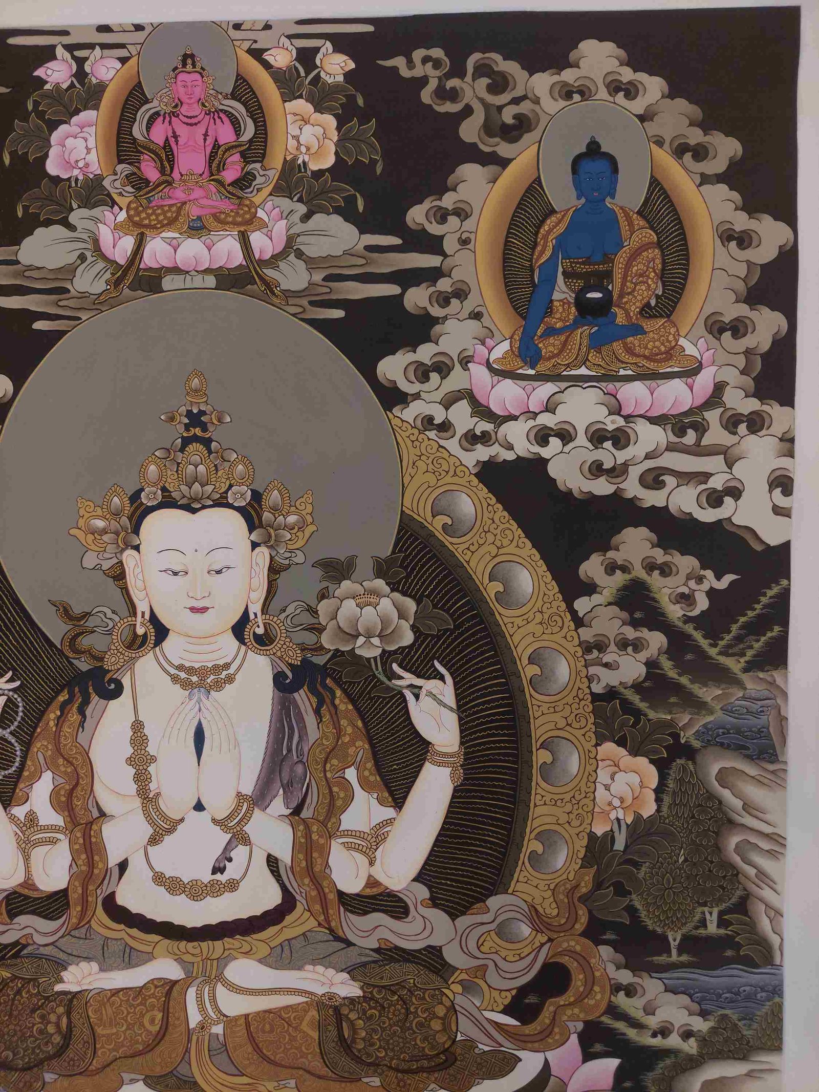 The first two, the inner arms, have palms joined at the heart, holding a sky-blue, and wish fulfilling jewel. This symbolizes that in whatever way Chenrezig manifests to benefit beings, the quality of Chenrezig's mind is never separate from the all-pervasive primal wisdom.