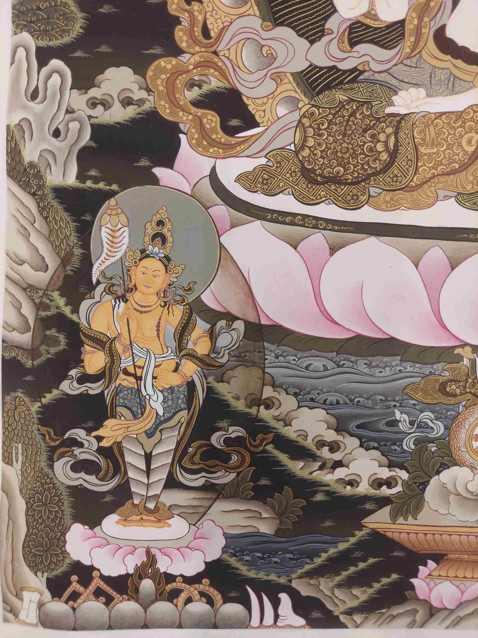 This thangka of Chenrezig has real gold painted on its surface along with other paints. This is an ancient process of decorating the thangka in Tibetan Buddhism, Here gold is ground into gold dust, which is then mixed with other undisclosed material to make it paintable on the canvas. this mixture is then mixed with transparent glue and painted on the thangka. Read More