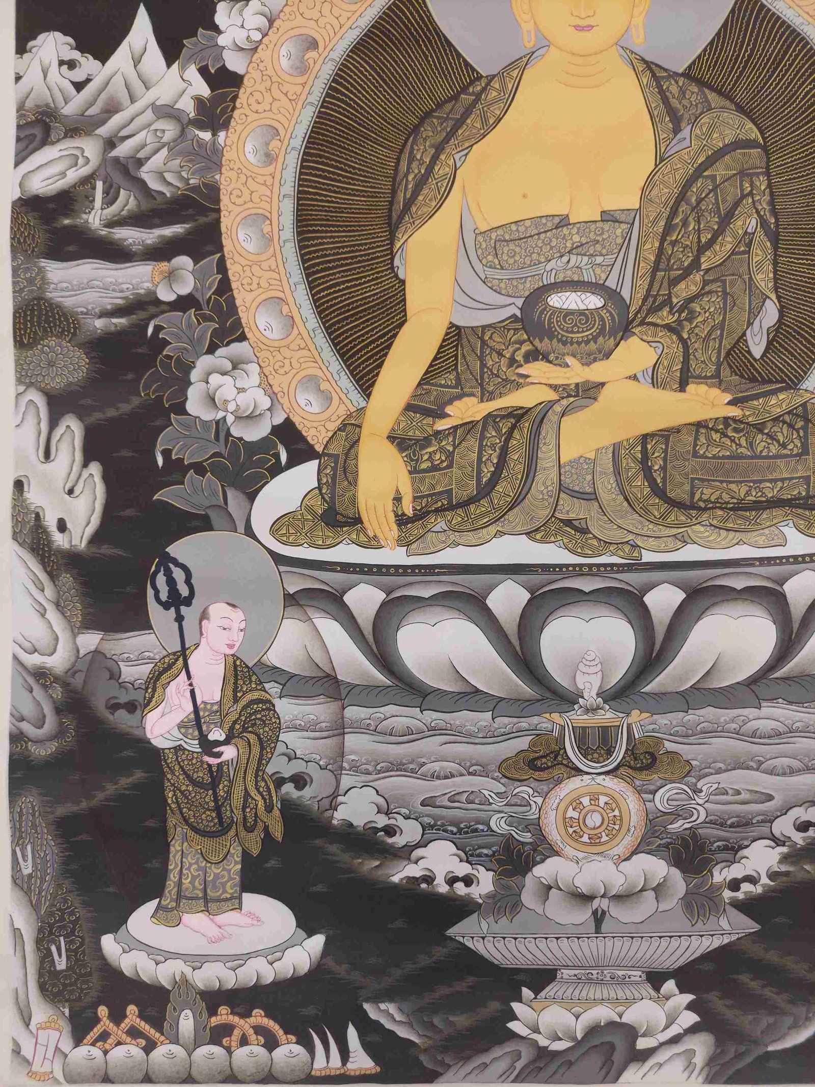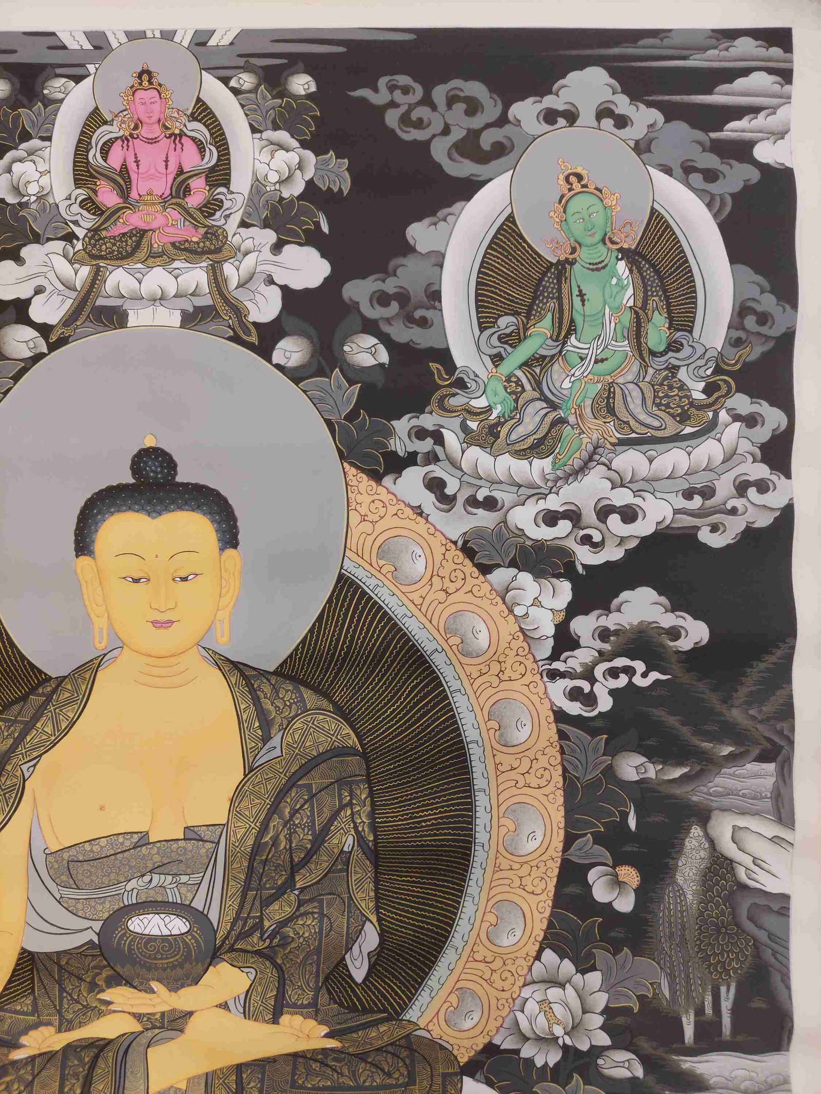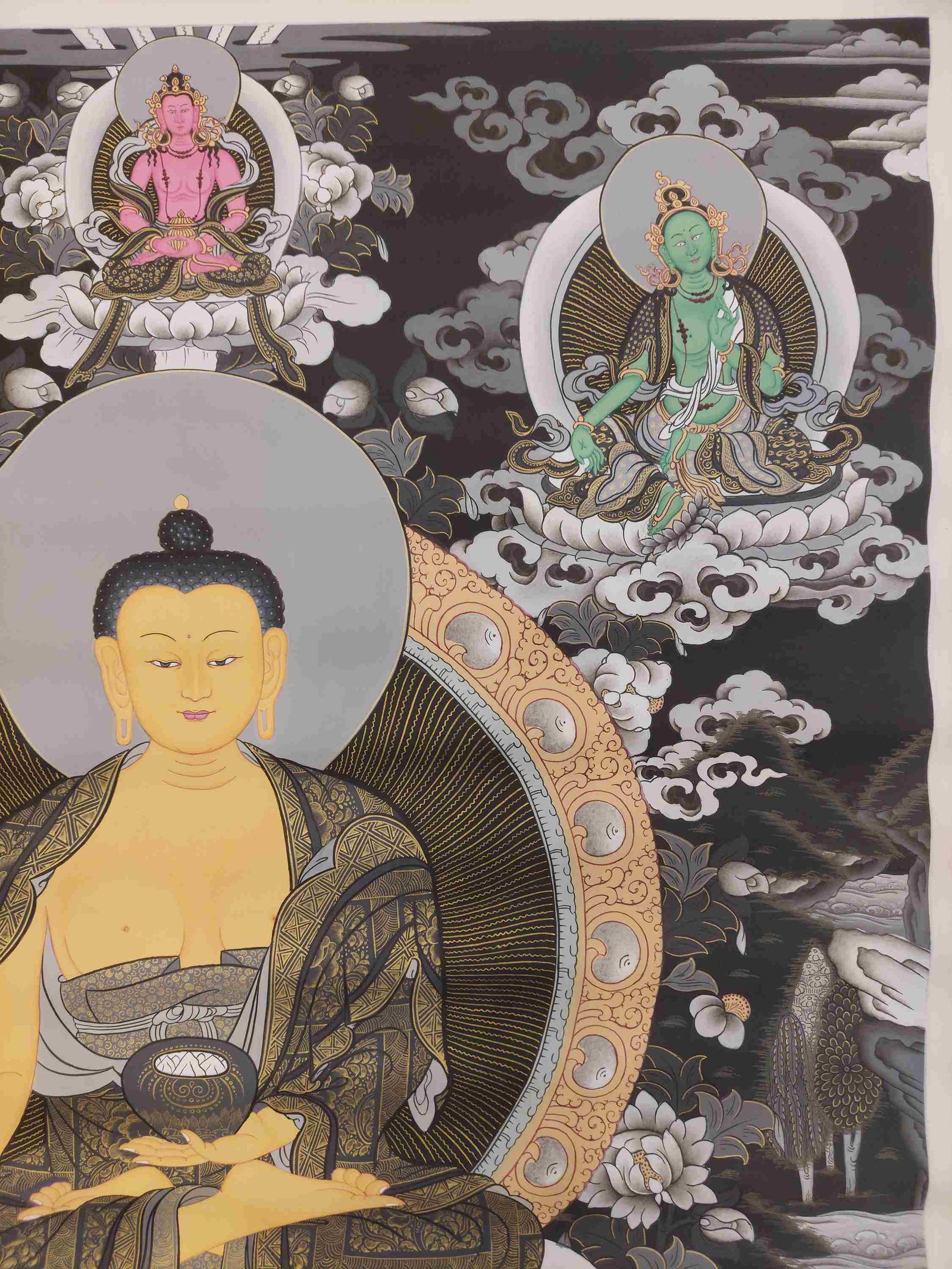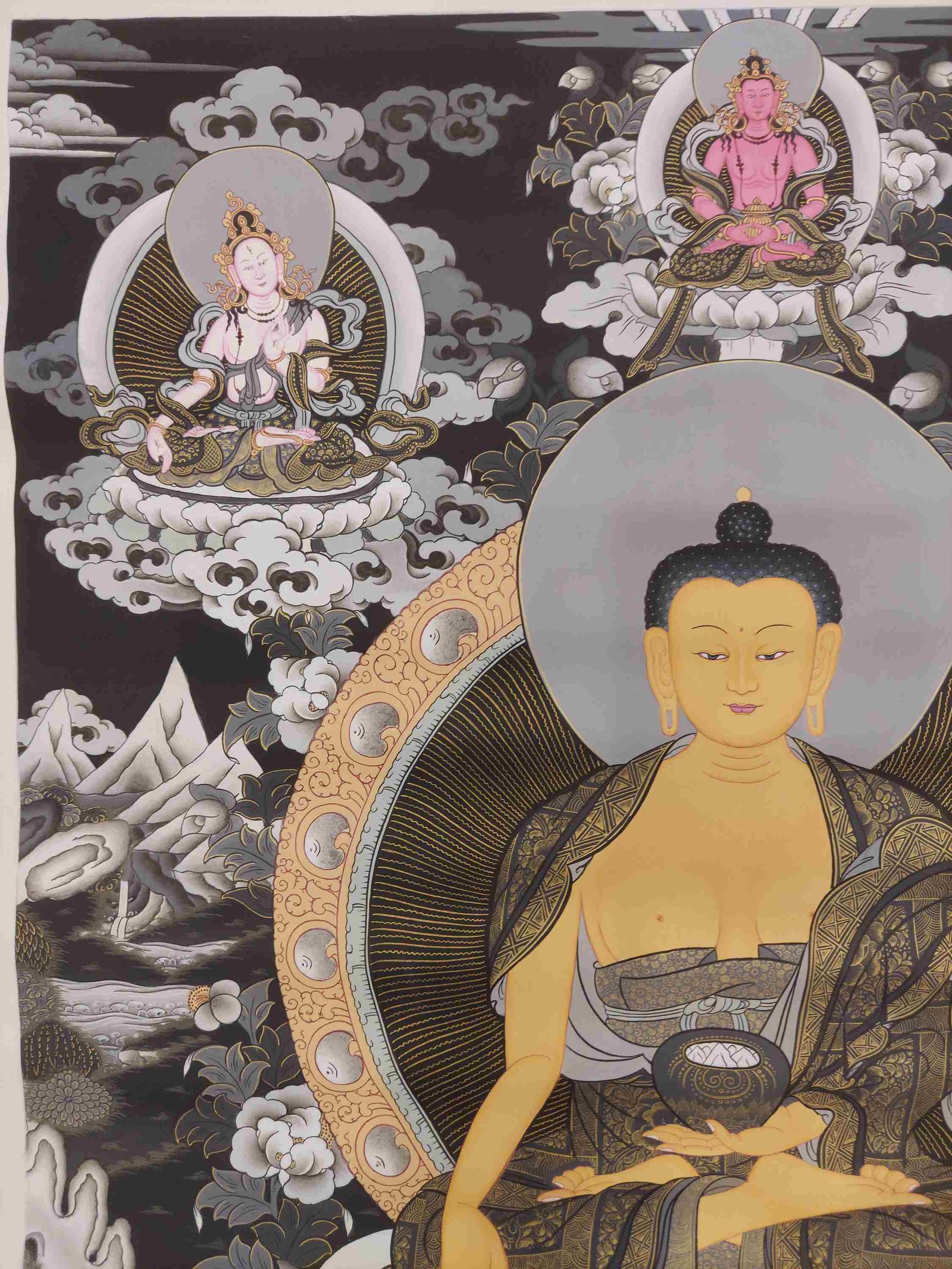 This thangka of Shakyamuni Buddha has real gold painted on its surface along with other paints. This is an ancient process of decorating the thangka in Tibetan Buddhism, Here gold is ground into gold dust, which is then mixed with other undisclosed material to make it paintable on the canvas. this mixture is then mixed with transparent glue and painted on the thangka. Read More