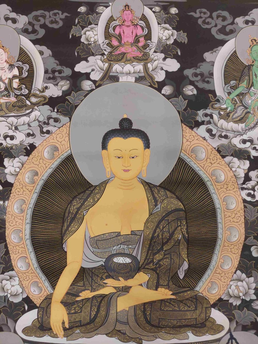 Buddhist Hand Painting Thangka of Shakyamuni Buddha Hand Painted, Real Gold, Surrounded By White Tara, Aparimita and Green Tara, Lamas Art , The Enlightened One and Teacher of Humanity