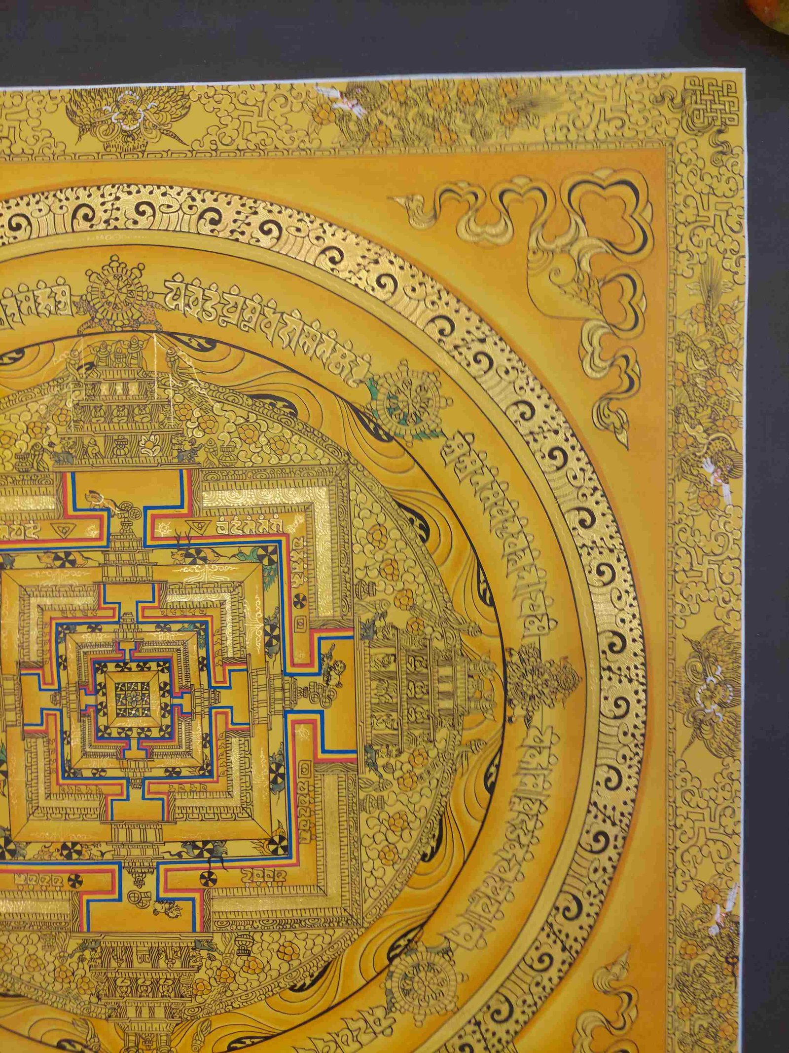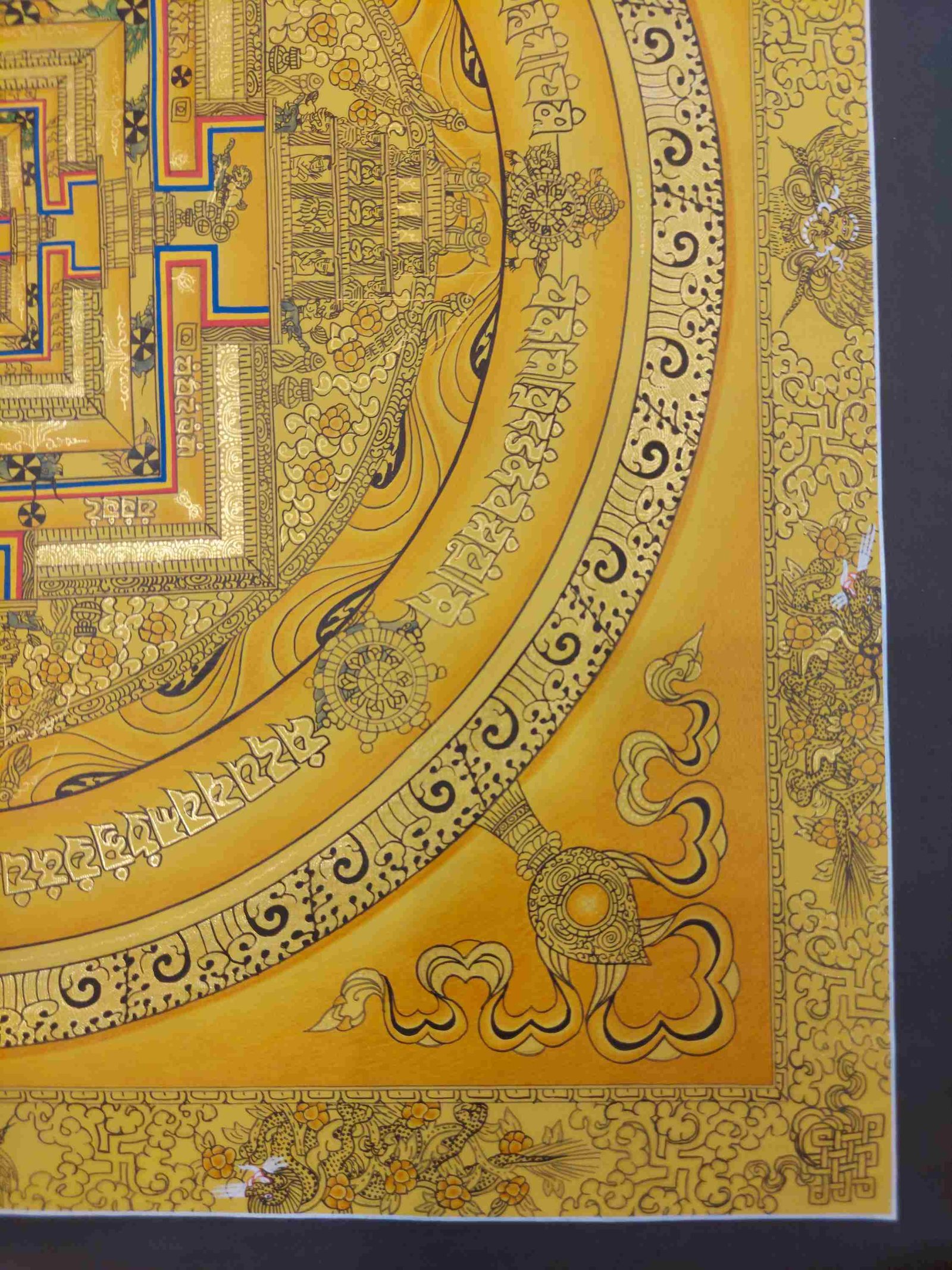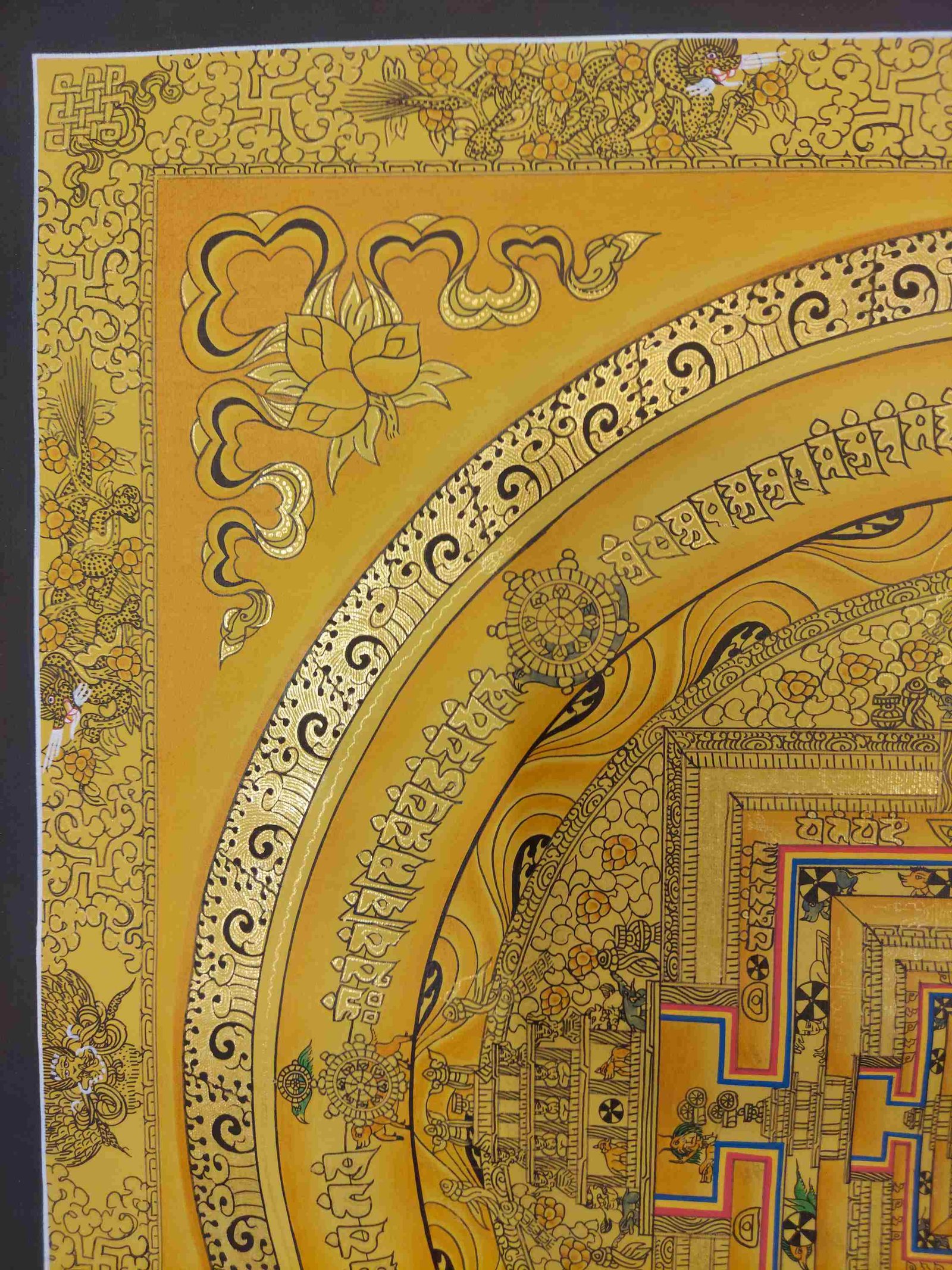 This thangka of Kalachakra Mandala has real gold painted on its surface along with other paints. This is an ancient process of decorating the thangka in Tibetan Buddhism, Here gold is ground into gold dust, which is then mixed with other undisclosed material to make it paintable on the canvas. this mixture is then mixed with transparent glue and painted on the thangka. Read More