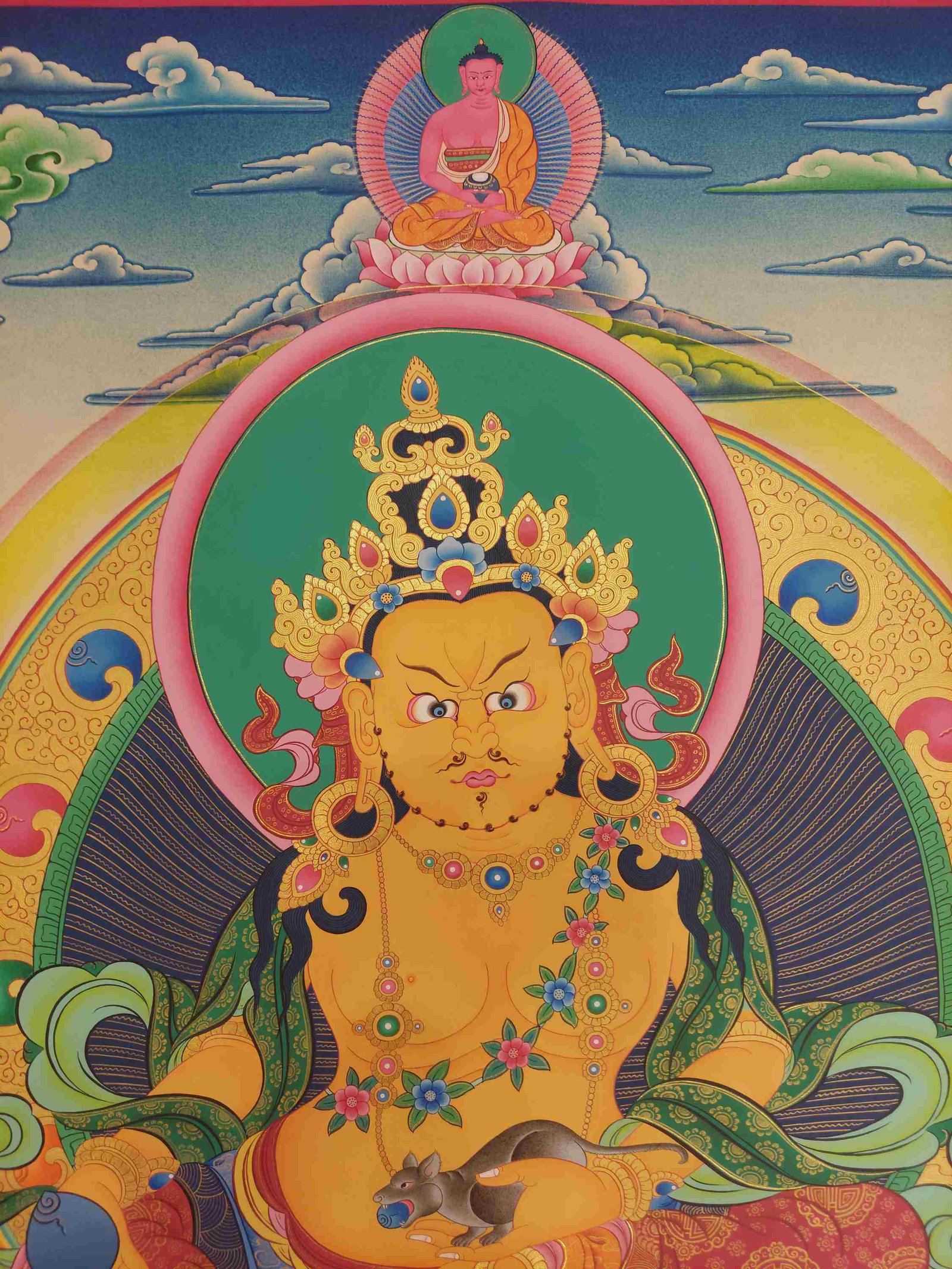 Buddhist Hand Painting Thangka of Yellow Jambhala Hand Painted, Lamas Art , fostering generosity and abundance
