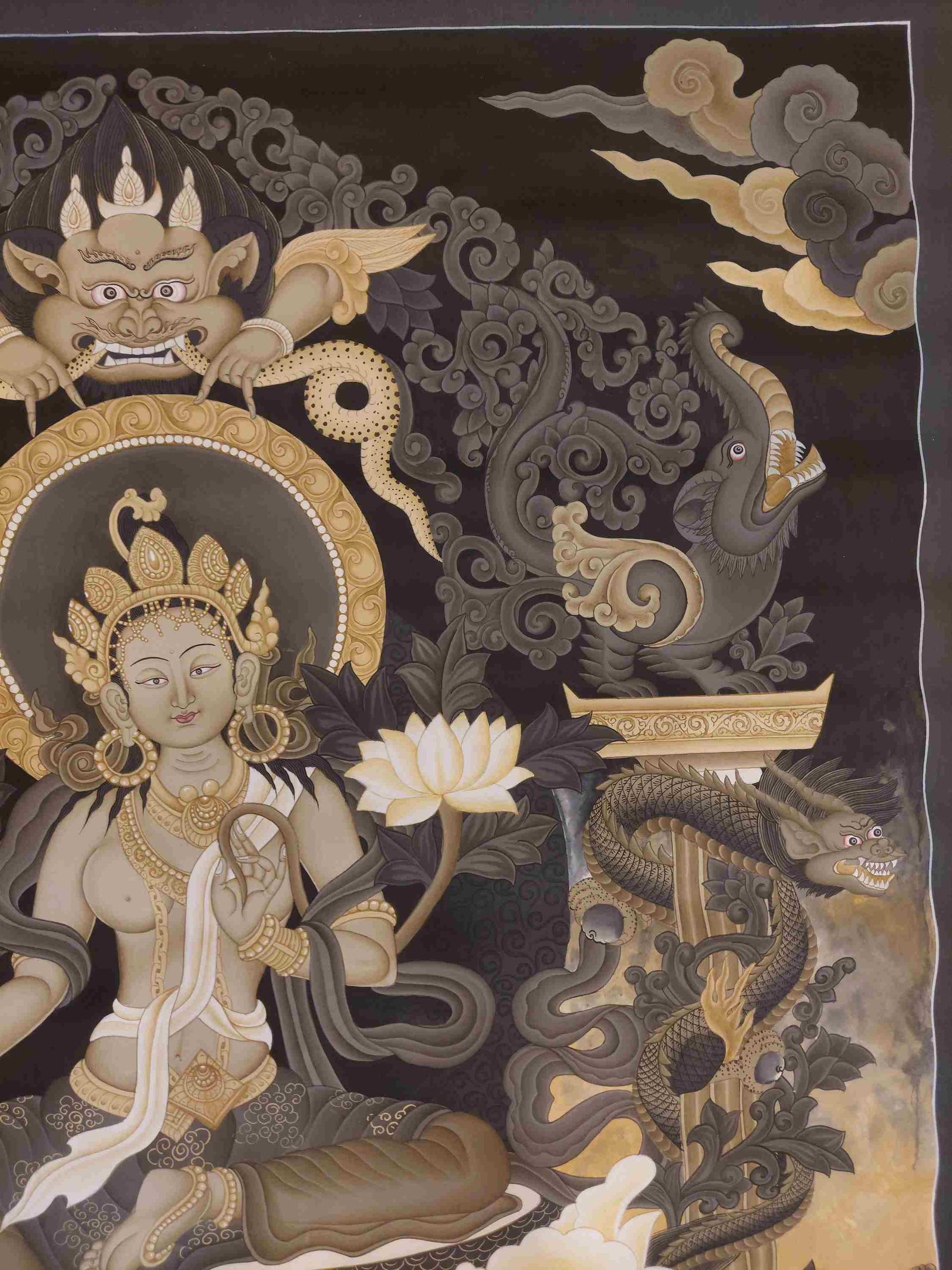 A thangka, also known as tangka, thanka, or tanka, is a vibrant and intricate Tibetan Buddhist painting that serves as a visual representation of spiritual teachings. Crafted with meticulous detail on cotton or silk appliqué, thangkas depict a wide range of subjects including Buddhist deities, sacred scenes, mandalas, and narrative stories. These sacred artworks are traditionally kept unframed and rolled up for storage, resembling ancient scrolls. To protect their delicate nature, thangkas are mounted on textile backings and often adorned with a silk cover on the front. Proper preservation in dry environments is crucial to maintain the integrity and longevity of the silk. Read More