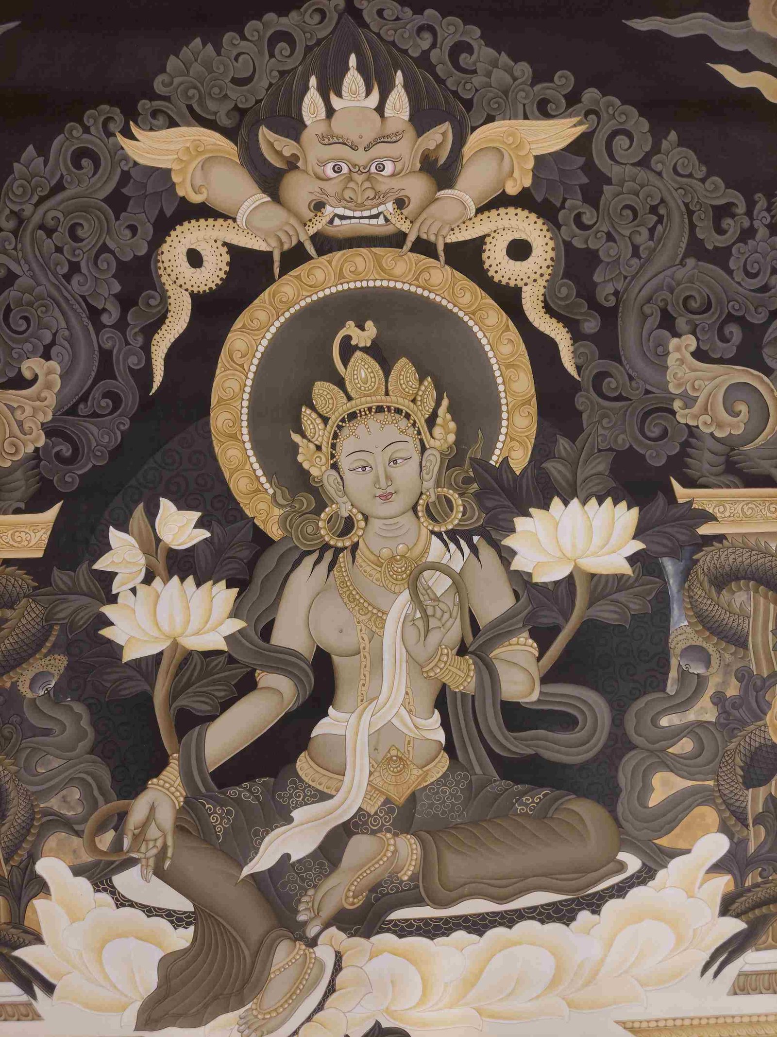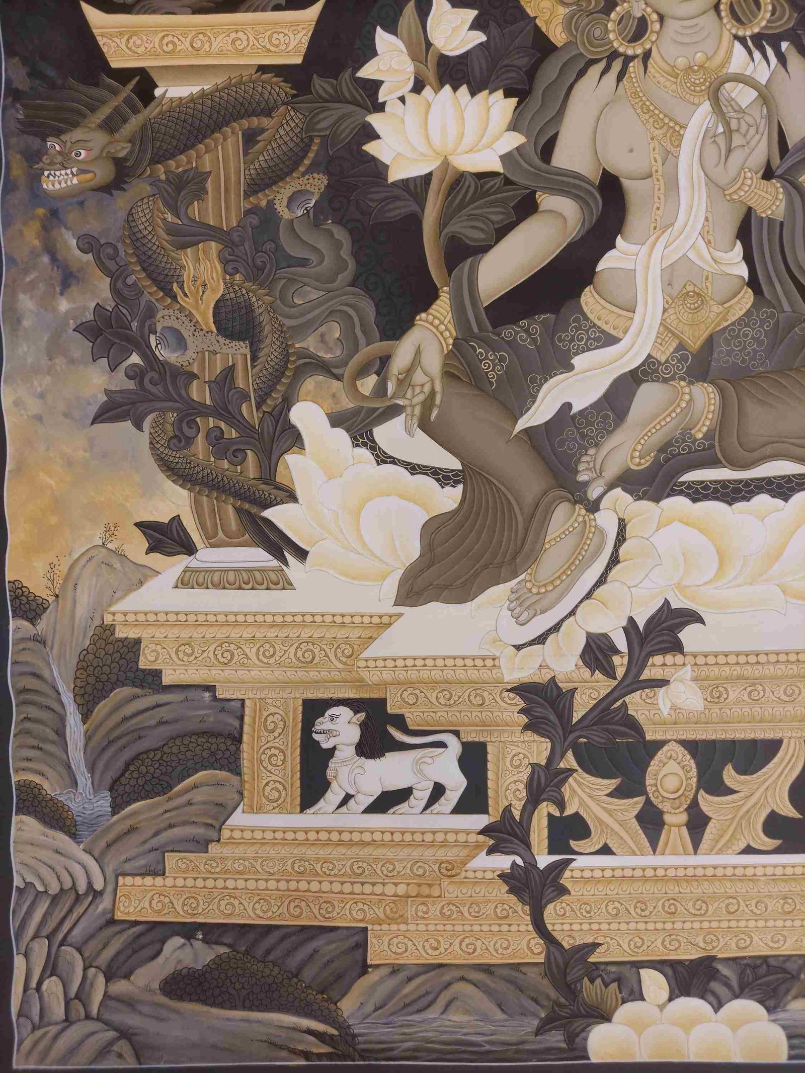 This Green Tara is a newari thangka or Paubaha, Paubha, also known as "paubhas," is a traditional religious painting created by the Newar people of Nepal. These exquisite artworks depict various subjects, including deities, mandalas, and monuments, and serve as aids for meditation and spiritual practices. Paubhas are similar to Tibetan Thangka paintings and are highly regarded for their religious and cultural significance.