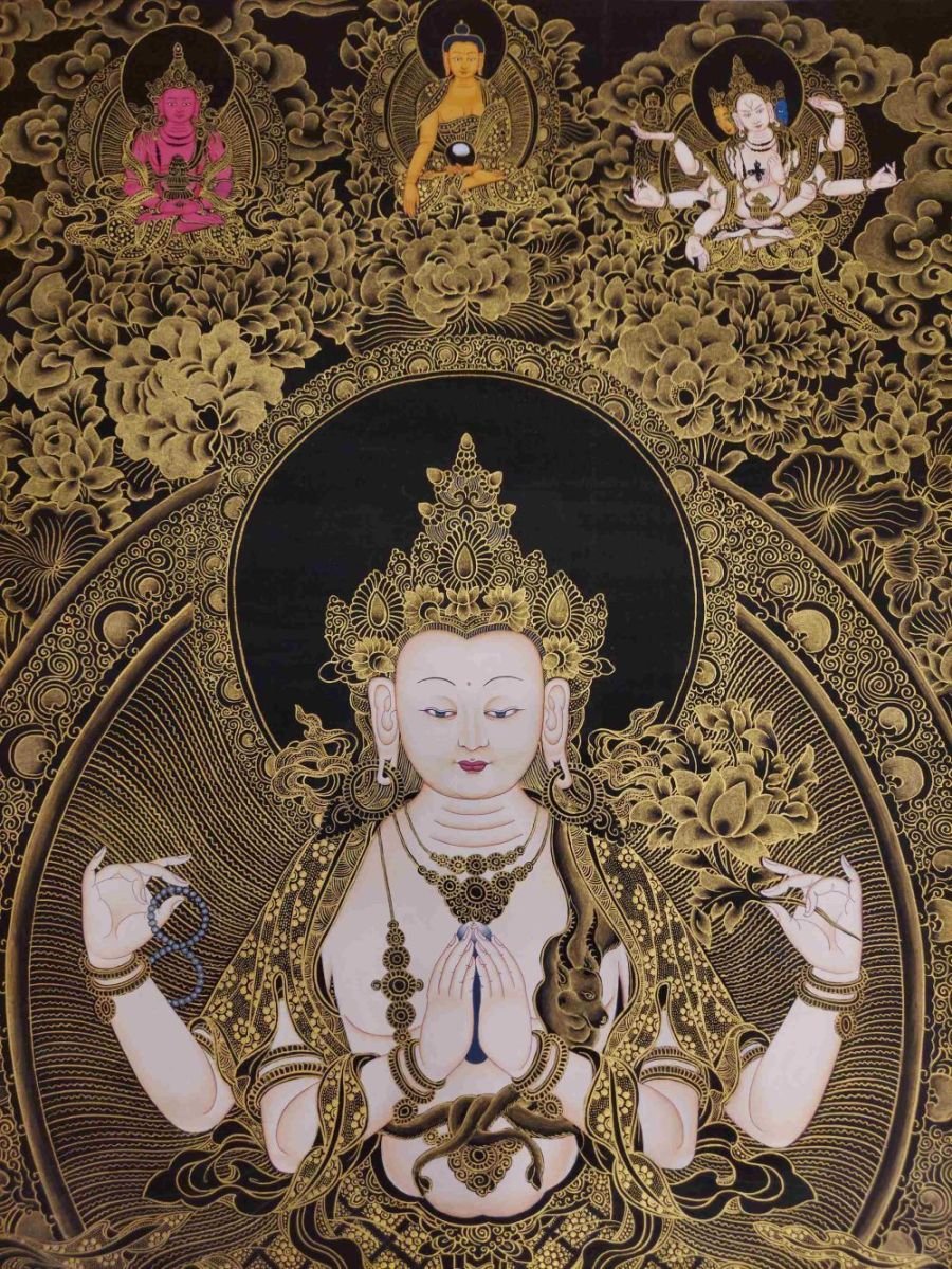 Of all the deities in Mahayana Buddhism, the bodhisattva Avalokiteshvara, Chenrezig, is one of the most celebrated. He is the lord gifted with complete enlightenment, who refrains from entering the blissful state of nirvana to remain here below and save the living being of the earth. This devotion to the salvation of others emphasizes profound compassion.