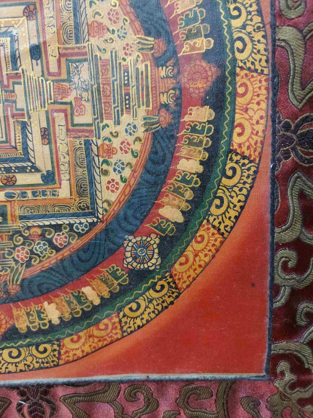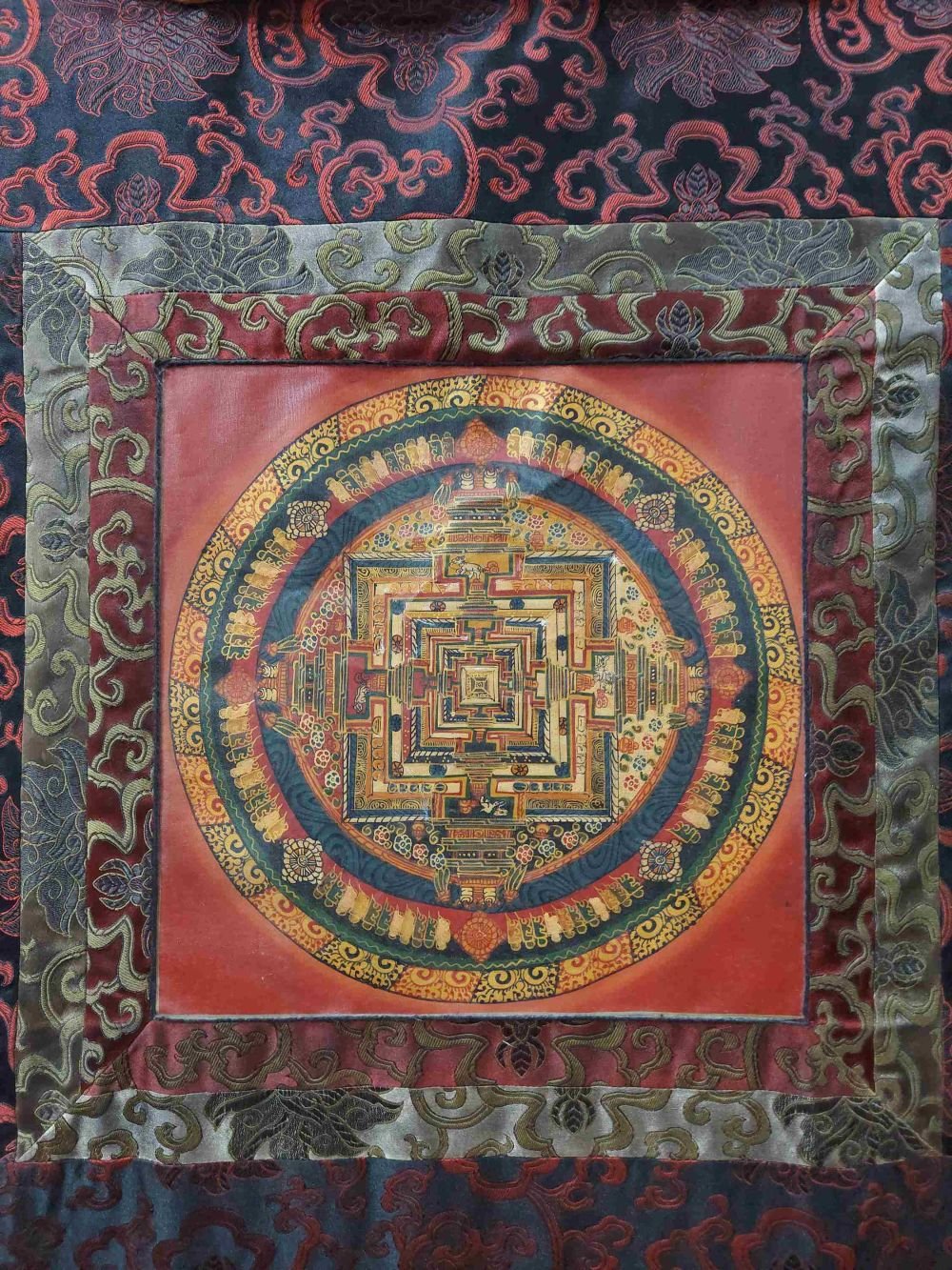 Buddhist Hand Painting Thangka of Kalachakra Mandala with Polyester Brocade, Hand Painted |