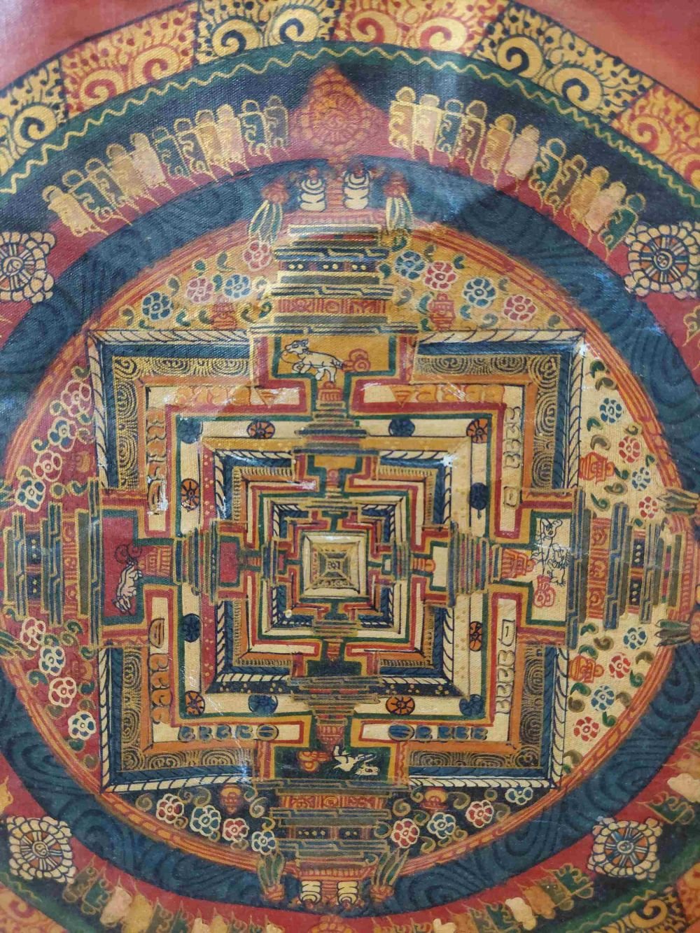 Although depicted here on a flat surface, the mandala is actually three-dimensional, being a five-storeyed "divine mansion", at the centre of which stands the Kalachakra deity the manifest state of Enlightenment.